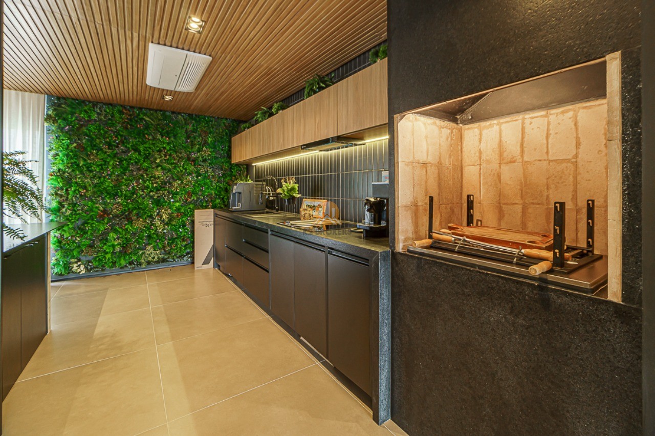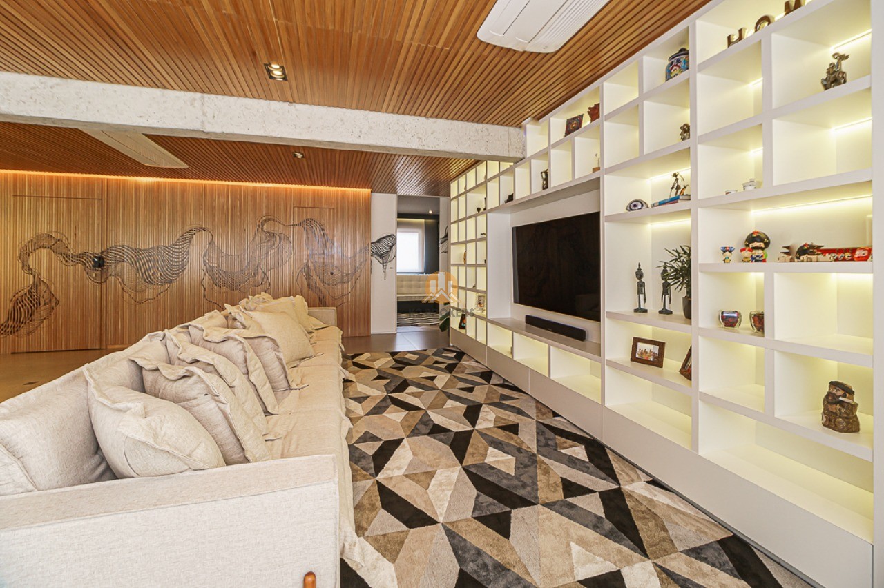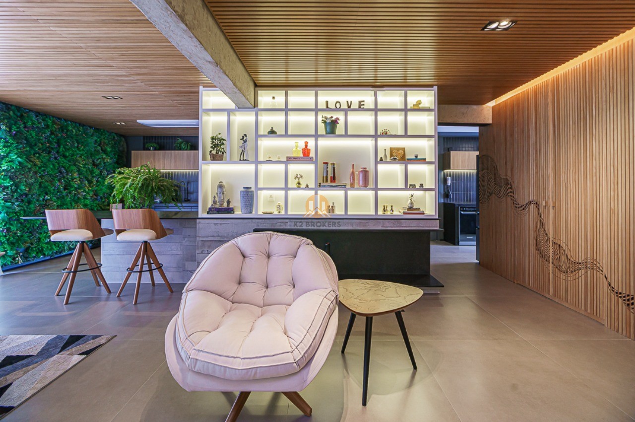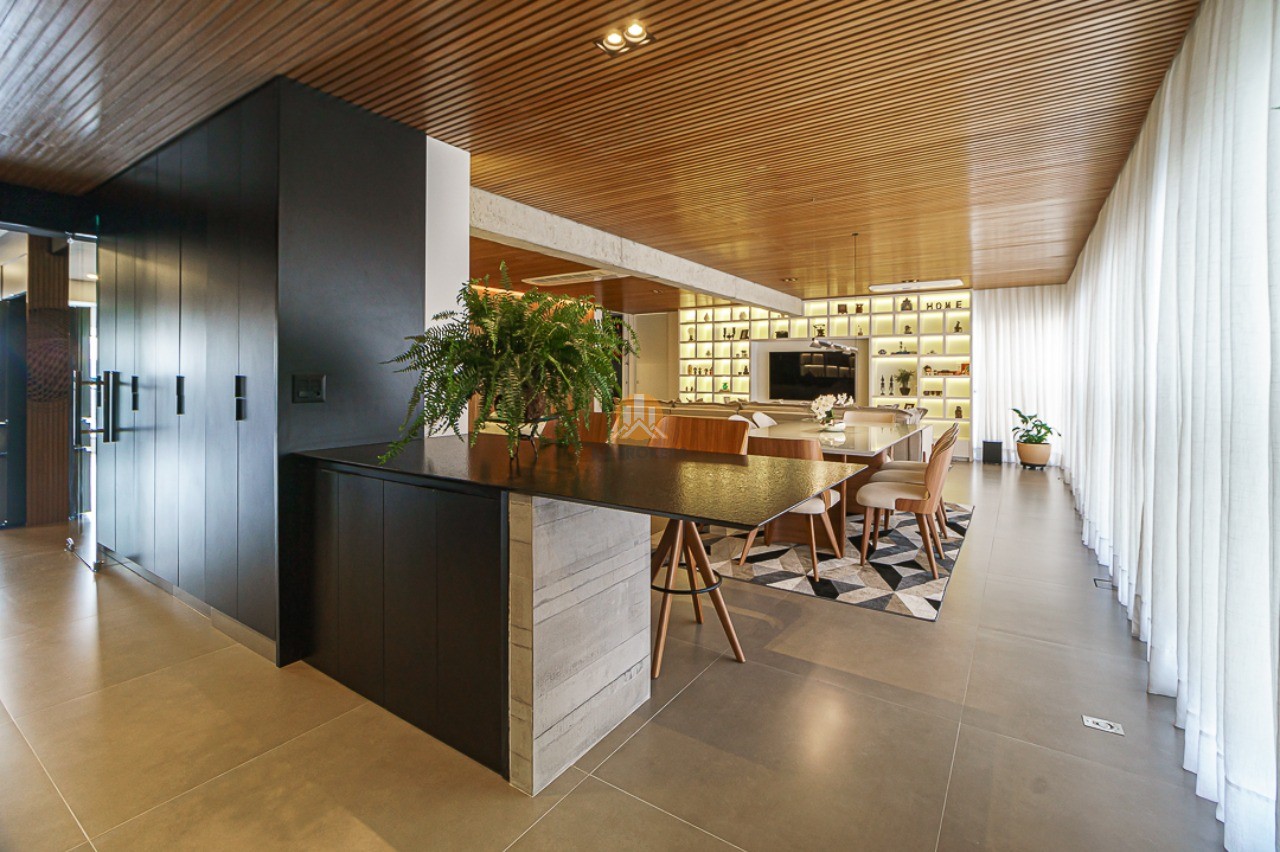 Ao adentrar neste apartamento, você será recebido por um hall social privativo com um jardim vertical e um espelho elegante, criando um ambiente acolhedor e luxuoso logo de cara. O living é espaçoso e integrado à sala de jantar e ao espaço gourmet, todos envidraçados para proporcionar uma vista deslumbrante. O ambiente conta com ar condicionado de teto, jardim vertical, churrasqueira e uma maravilhosa obra de arte do renomado artista plástico Giuliano Martinuzzo.