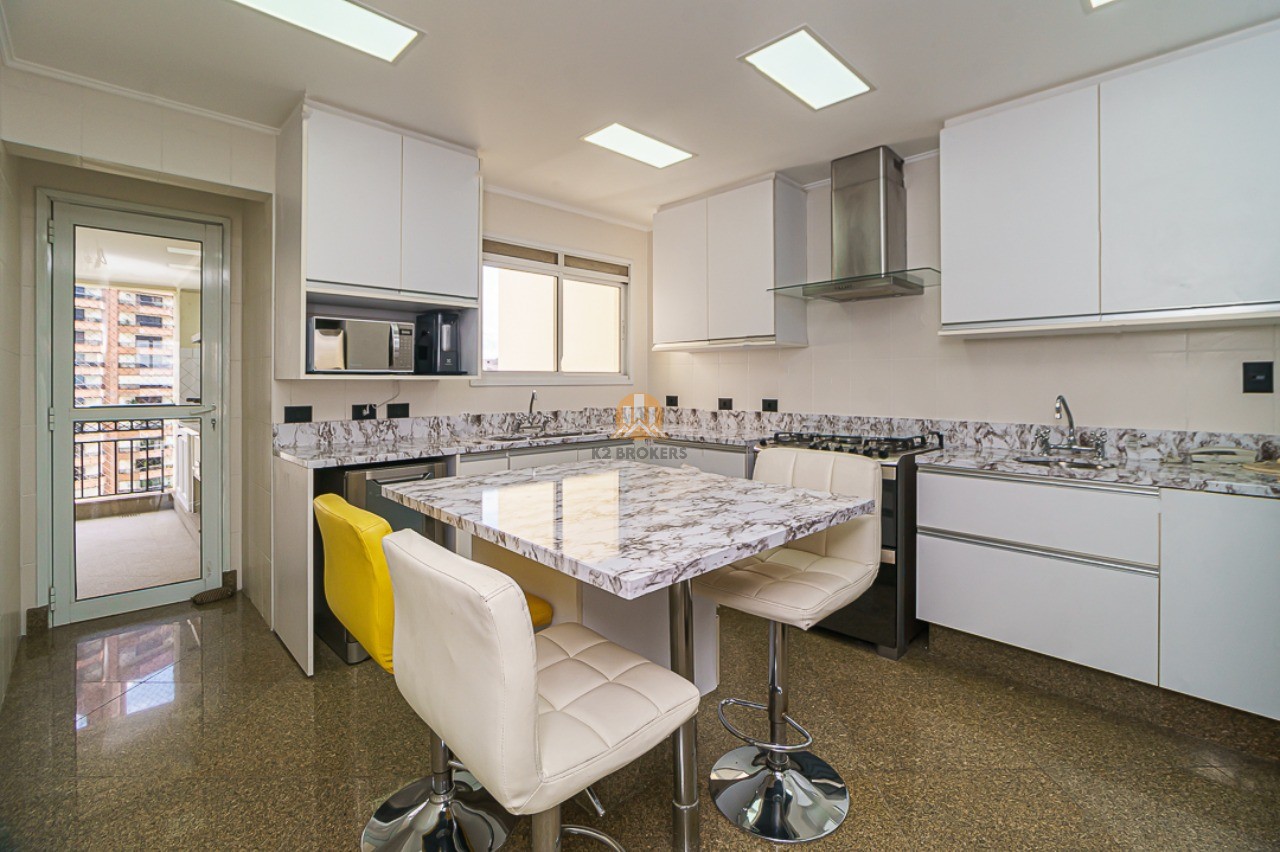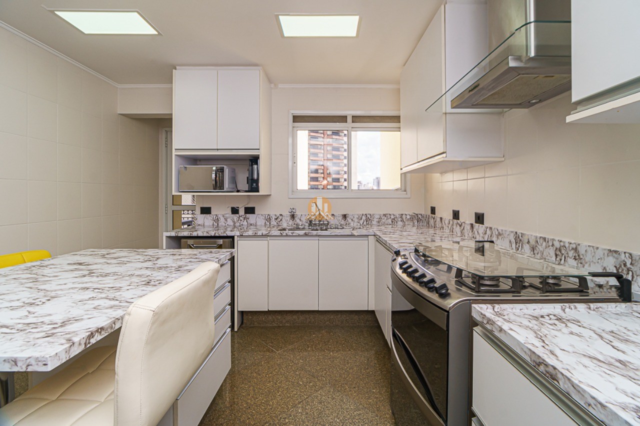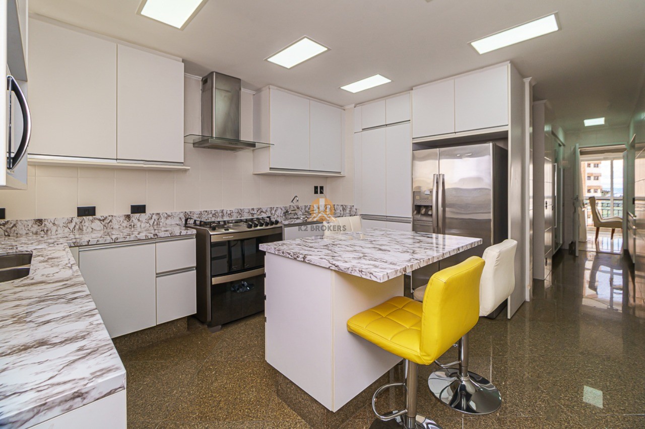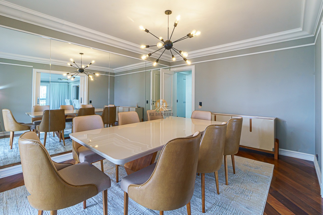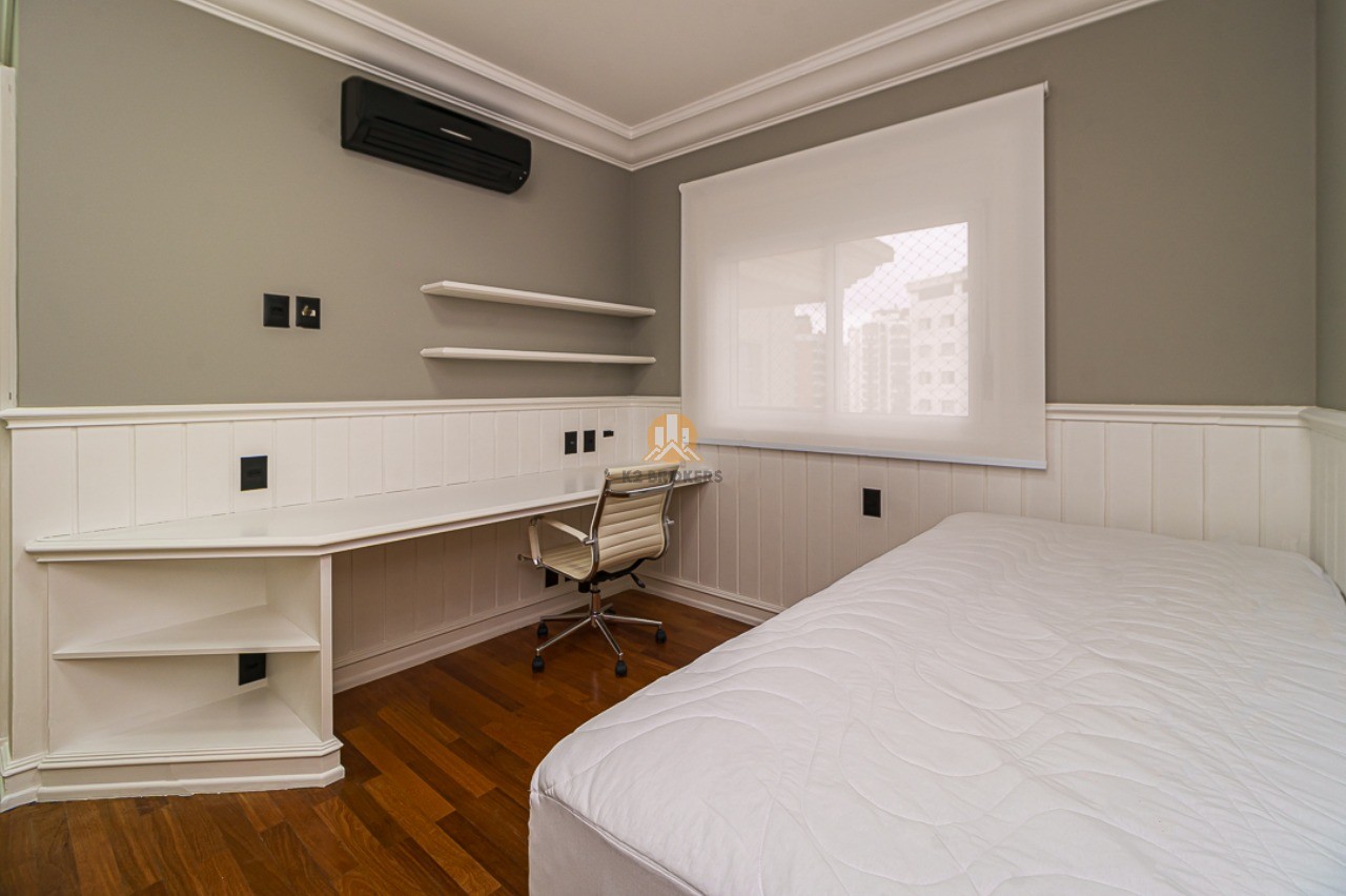 Todos os ambientes possuem ar condicionado e armários de marcenaria de alta qualidade, garantindo praticidade e elegância. A cozinha é equipada com ilha, fogão e coifa, além de uma ampla e arejada área de serviço.
