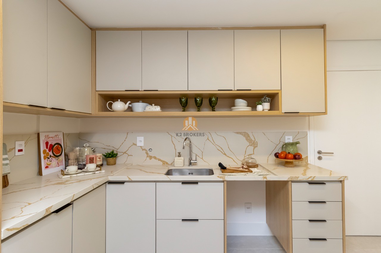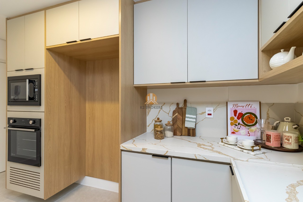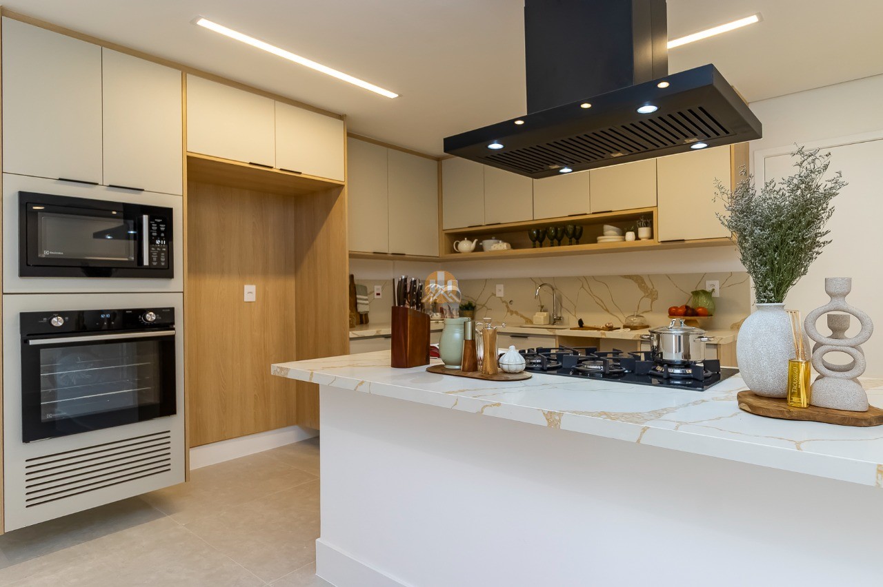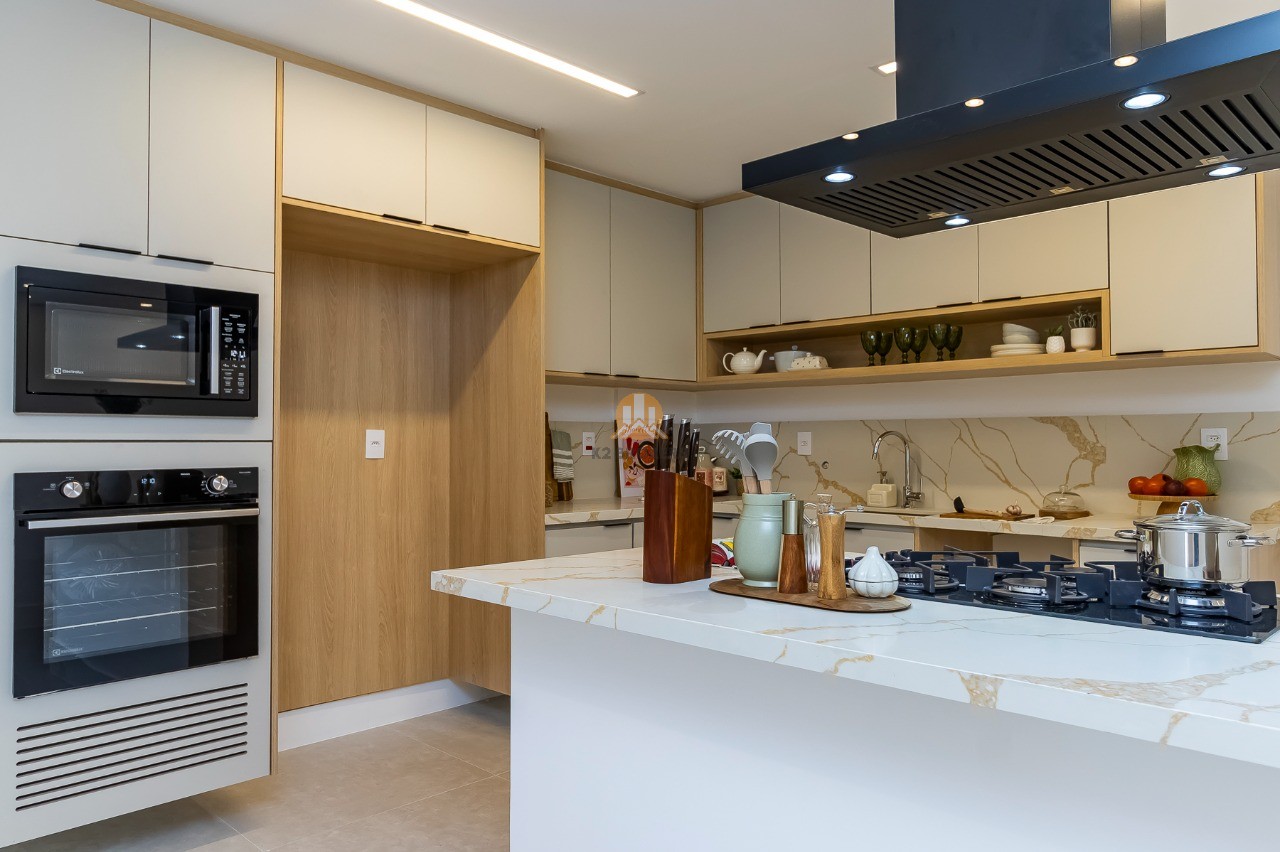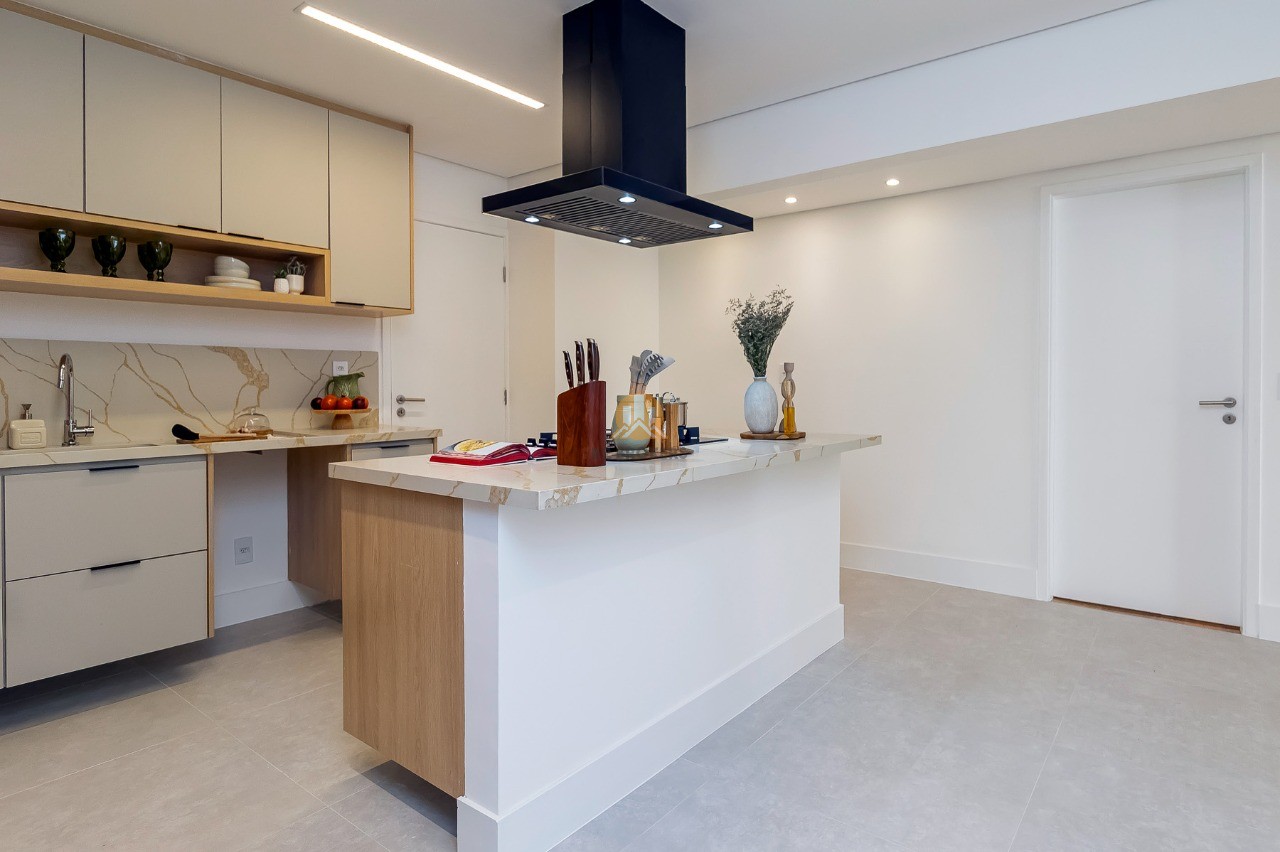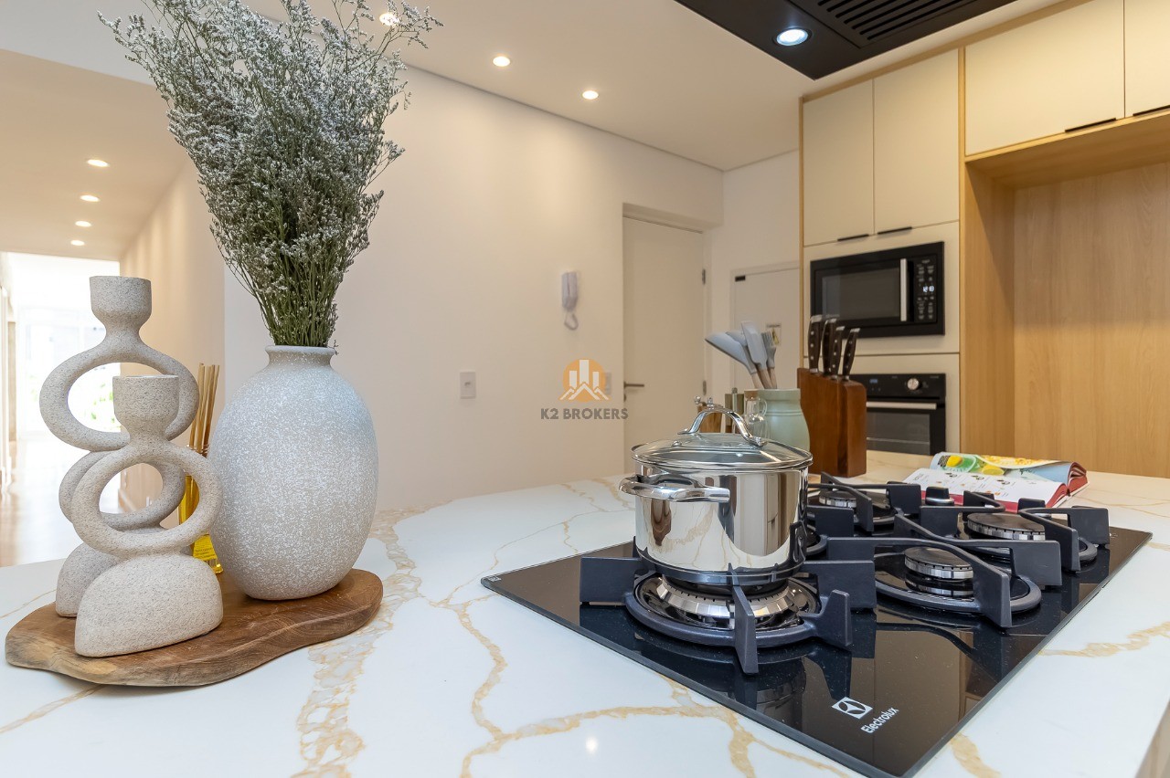 Os janelões de correr da sala, que vão do piso ao teto, proporcionam iluminação e ventilação abundantes, enquanto a marcenaria, cooktop, coifa, forno elétrico, microondas e aquecedor à gás garantem praticidade e conforto.