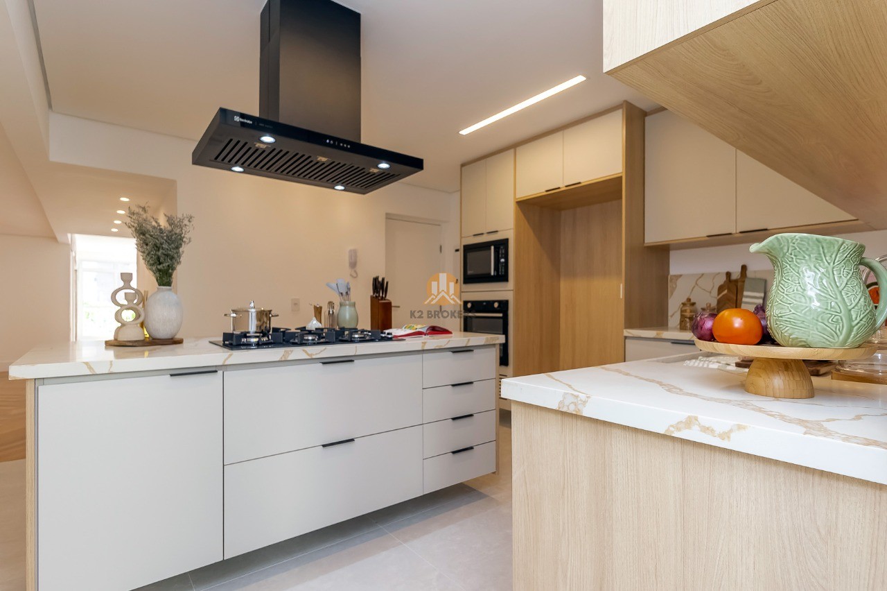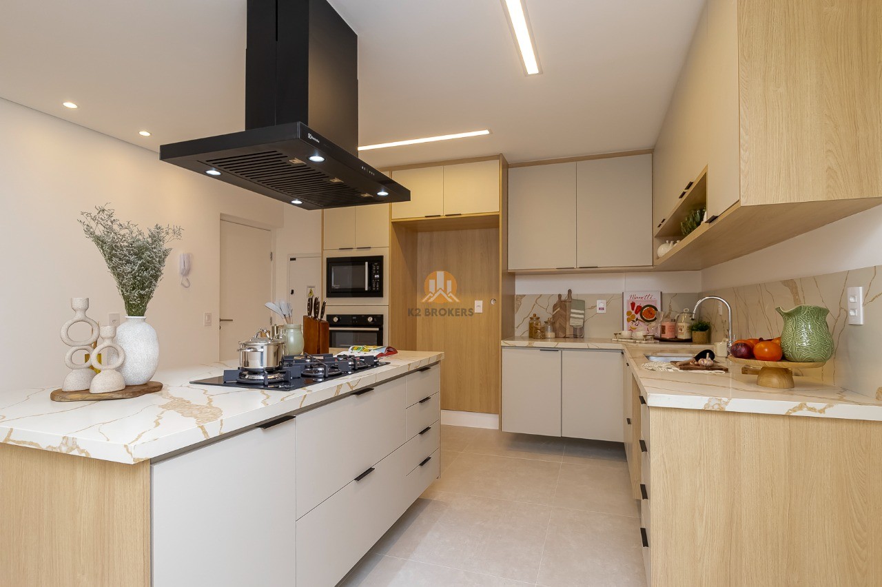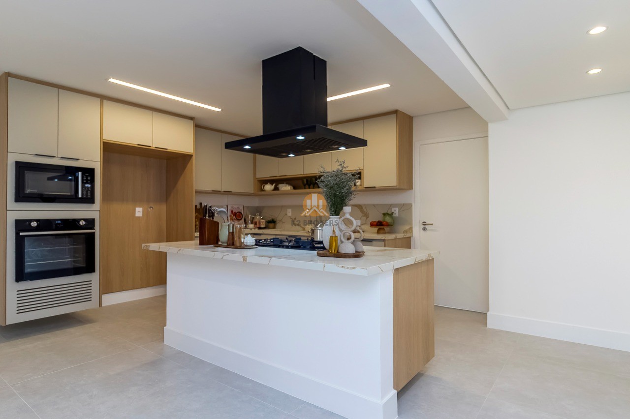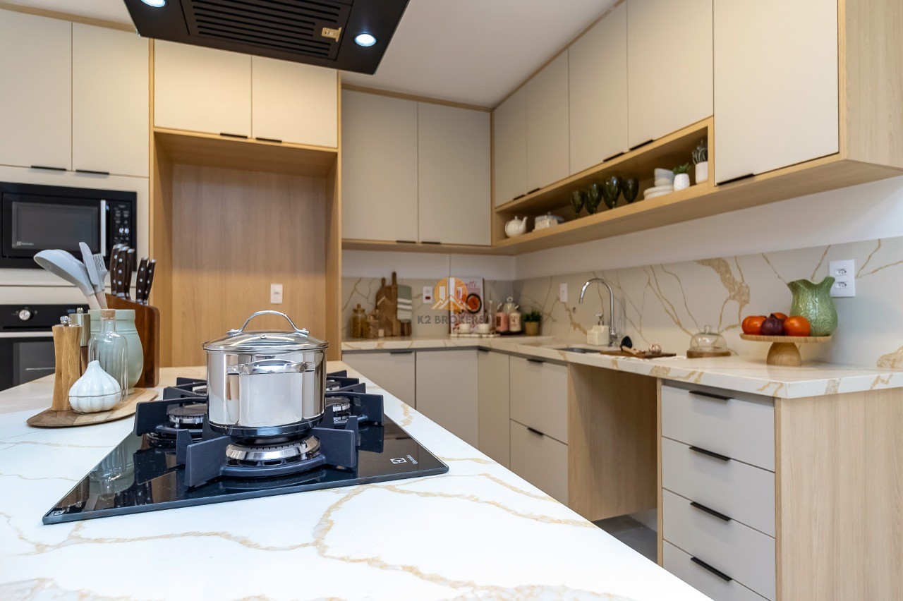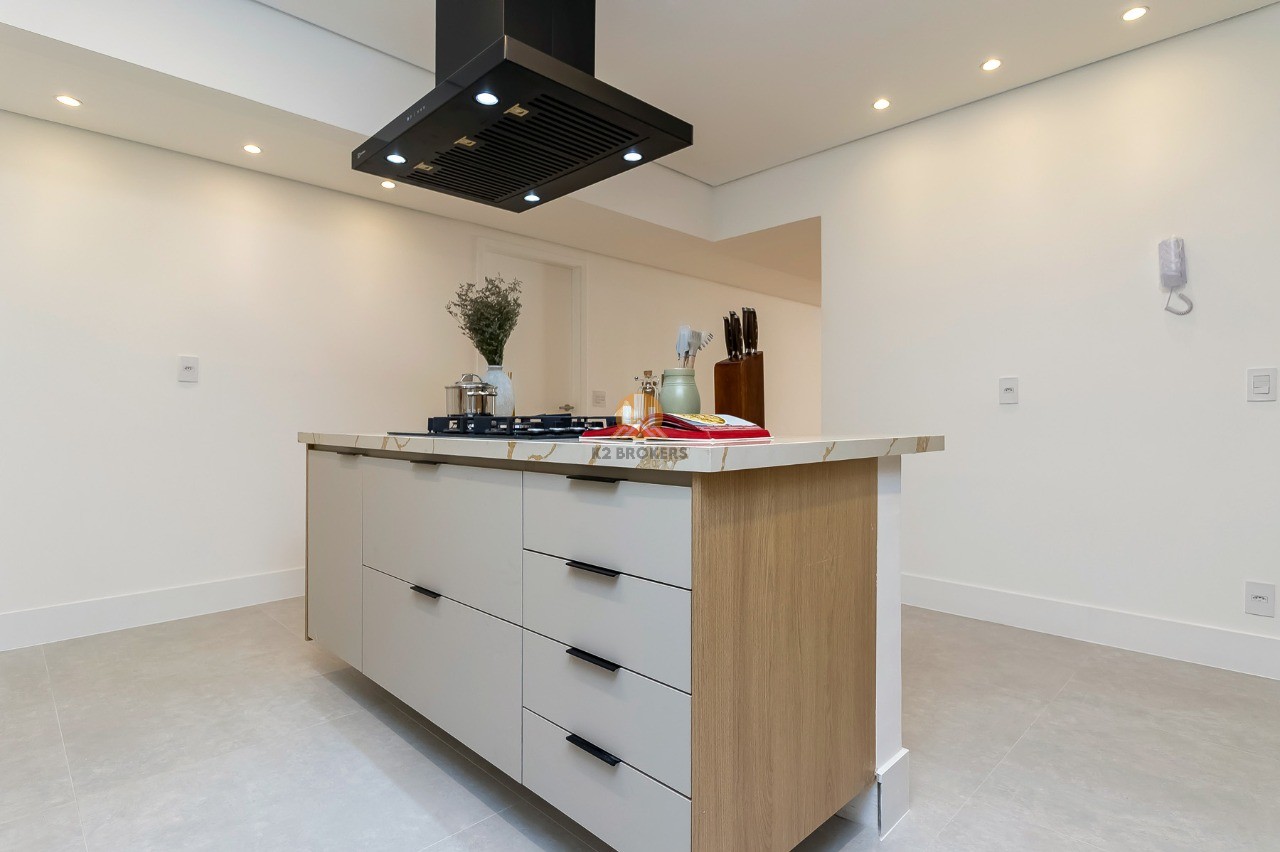 Os janelões de correr da sala, que vão do piso ao teto, proporcionam iluminação e ventilação abundantes, enquanto a marcenaria, cooktop, coifa, forno elétrico, microondas e aquecedor à gás garantem praticidade e conforto.