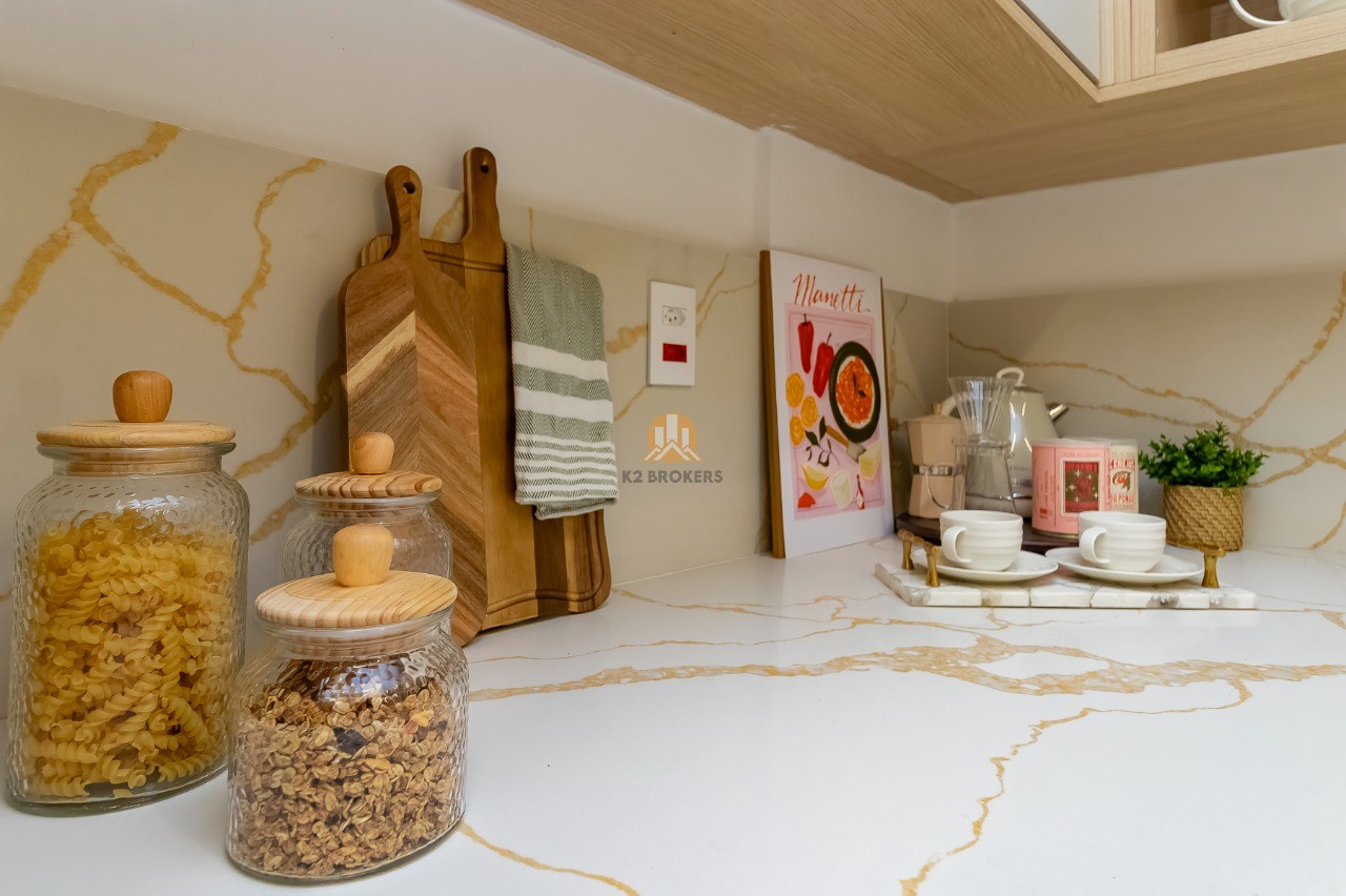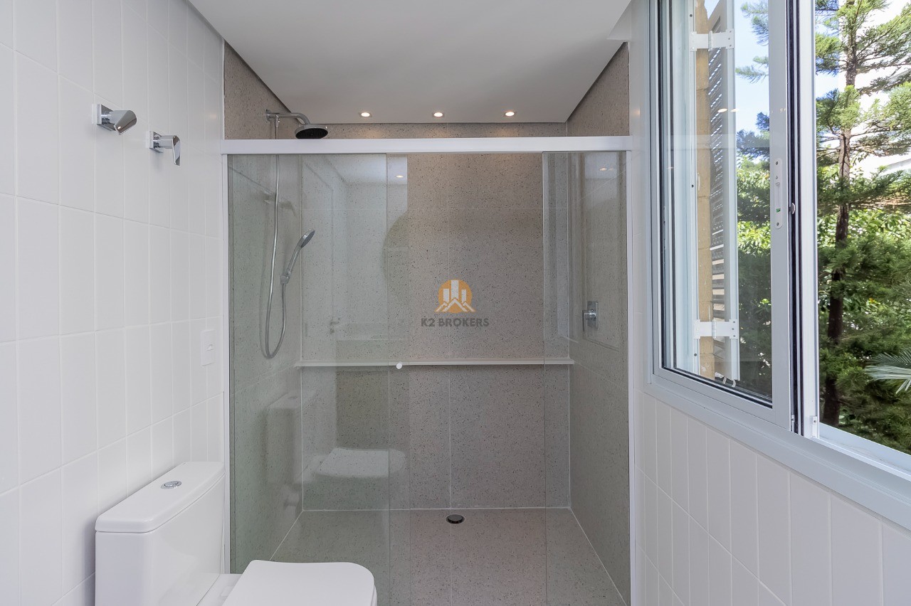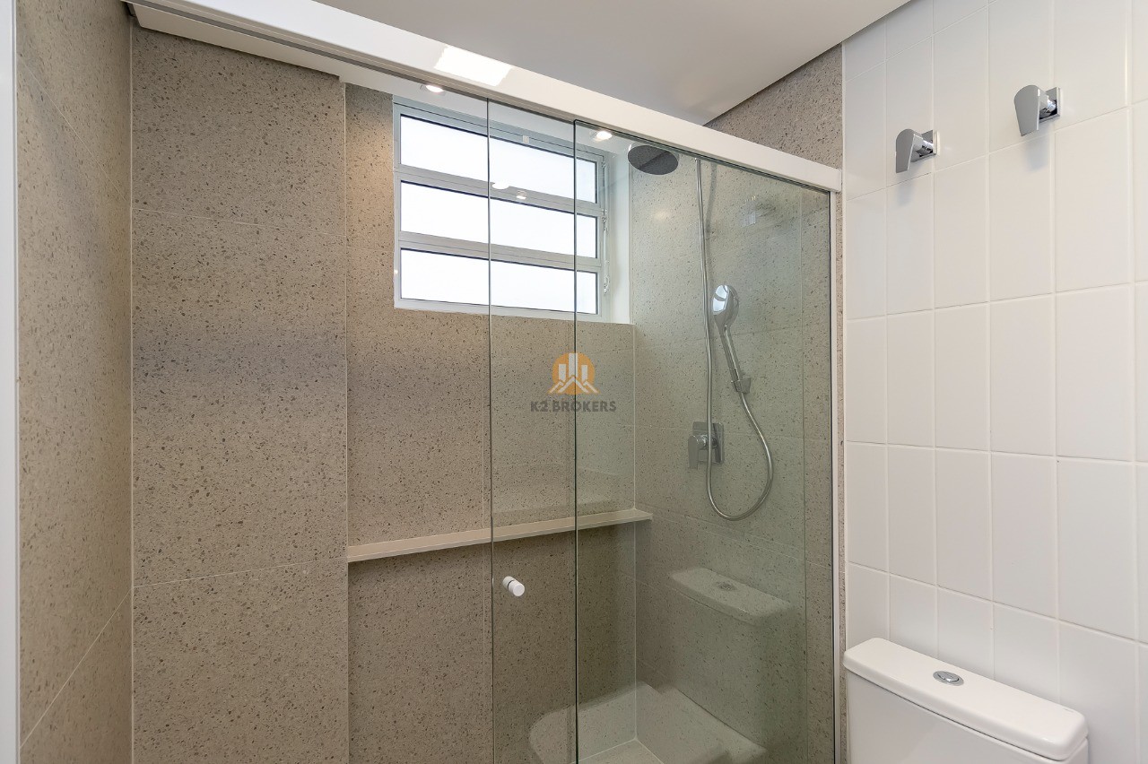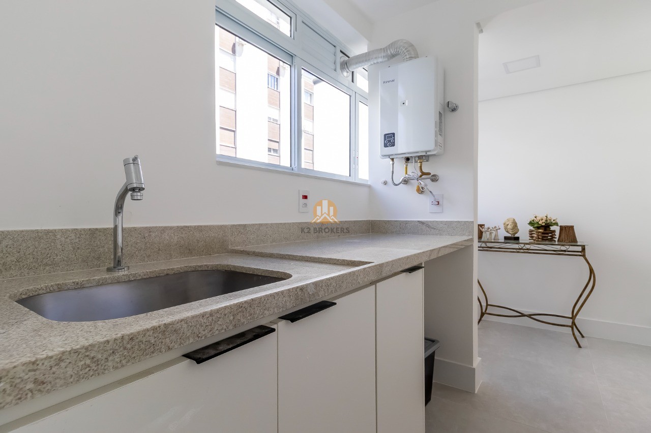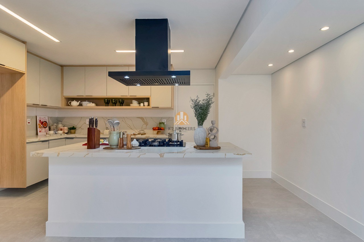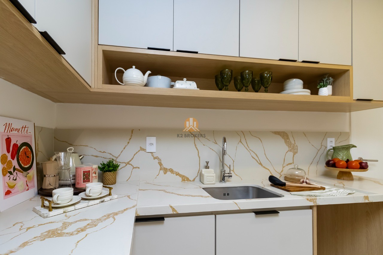 Os janelões de correr da sala, que vão do piso ao teto, proporcionam iluminação e ventilação abundantes, enquanto a marcenaria, cooktop, coifa, forno elétrico, microondas e aquecedor à gás garantem praticidade e conforto.