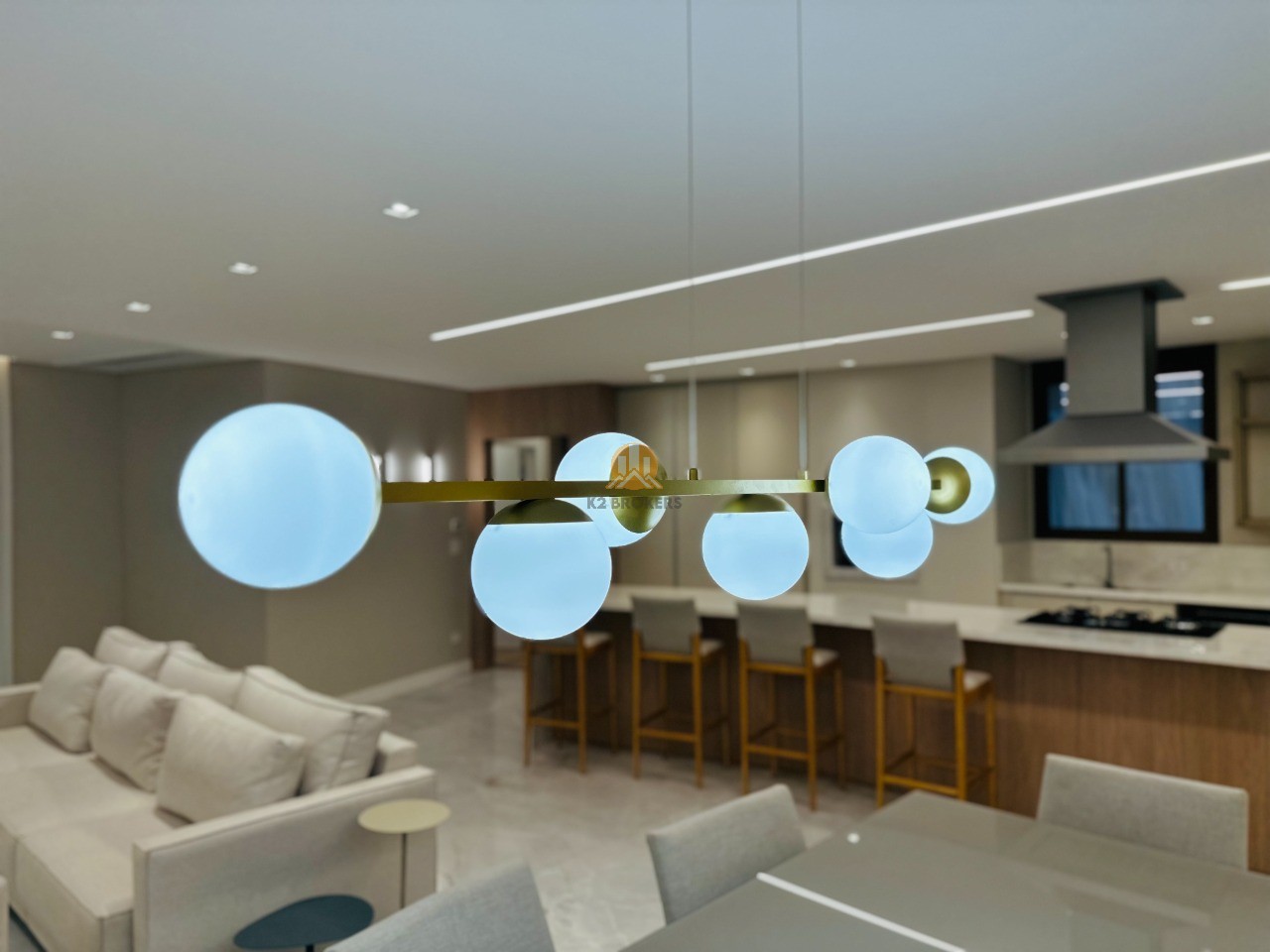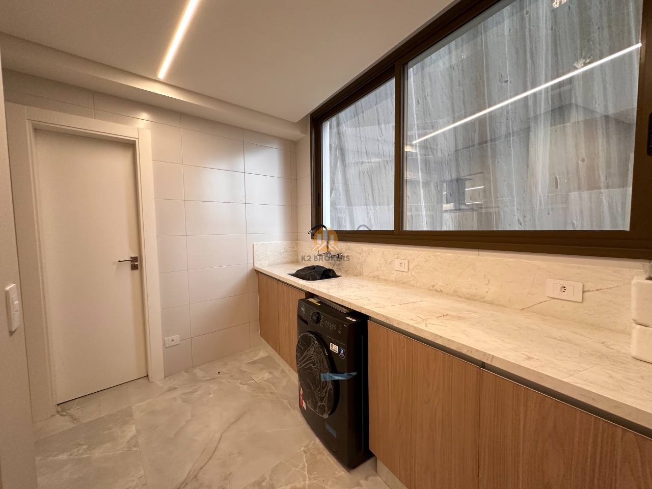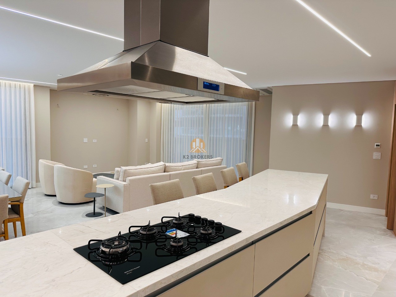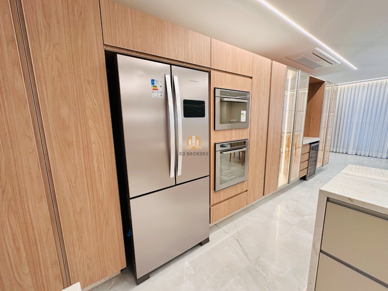 O apartamento é completamente decorado, incluindo eletrodomésticos, com 3 suítes - sendo a master com closet e banheiro duplo -, salas integradas à cozinha, banheiro na lavanderia, com 246m2 e 4 vagas de garagem.