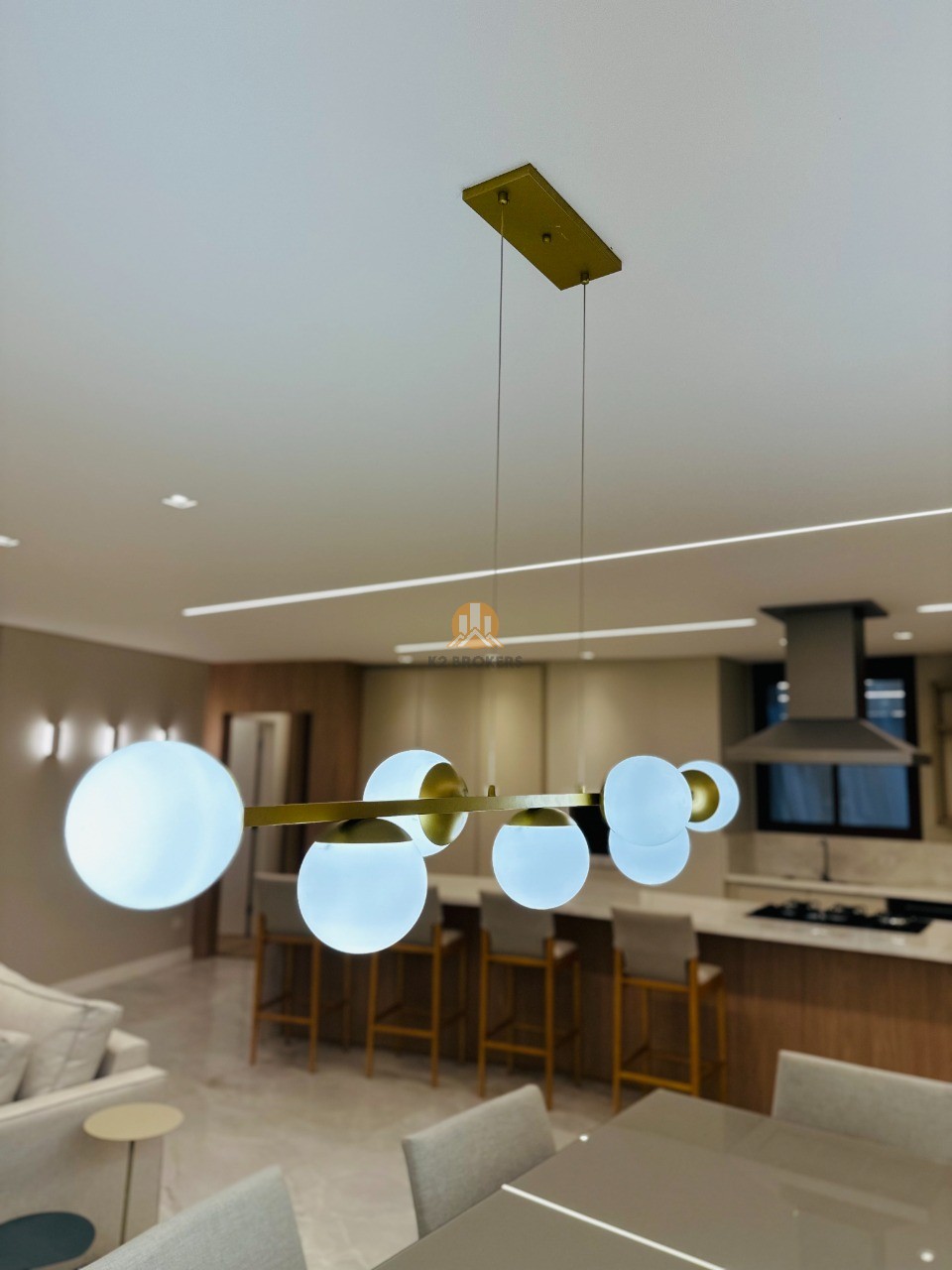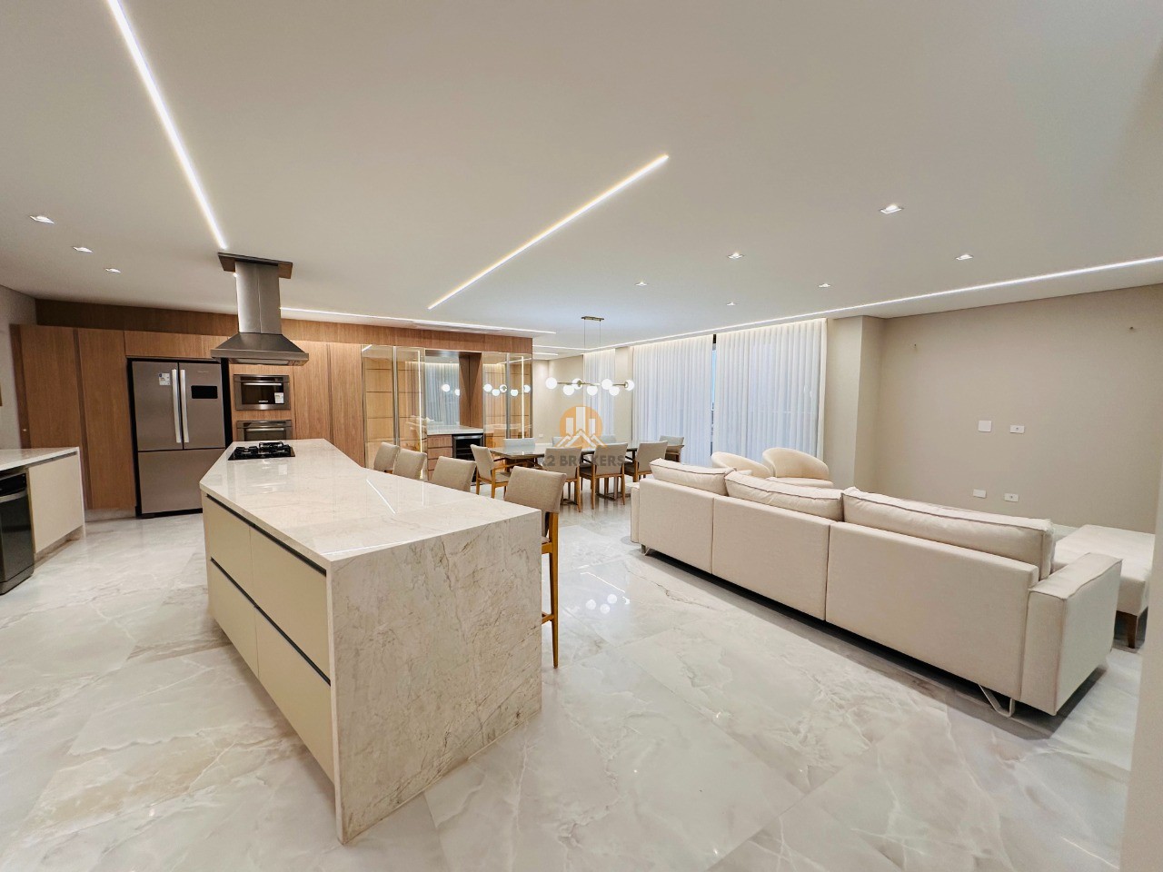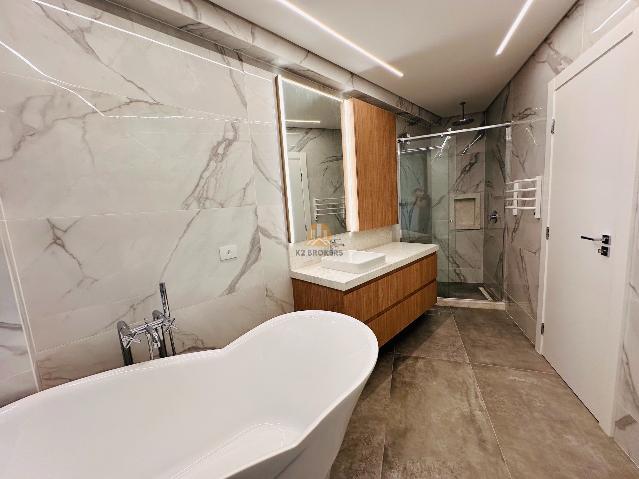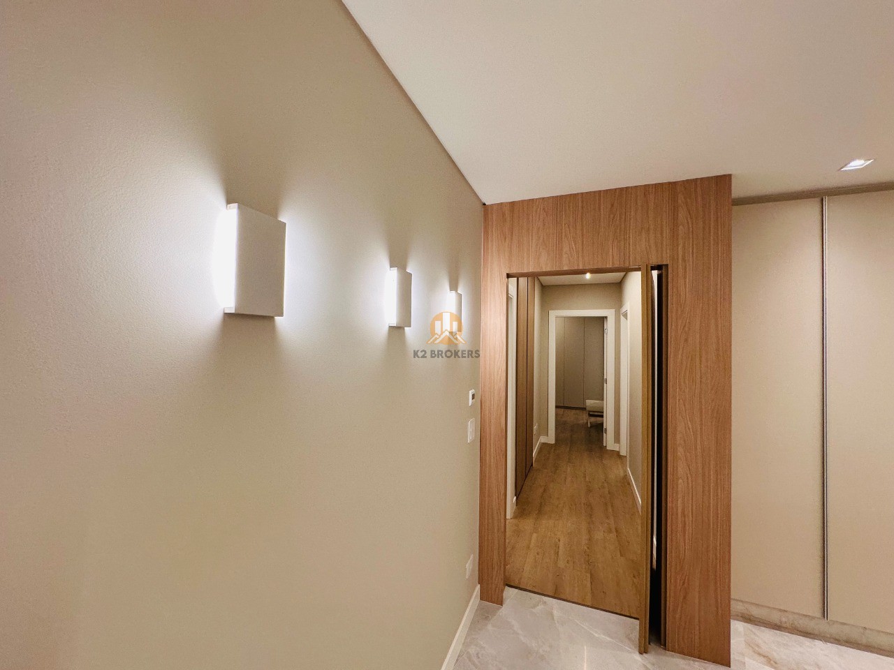O apartamento é completamente decorado, incluindo eletrodomésticos, com 3 suítes - sendo a master com closet e banheiro duplo -, salas integradas à cozinha, banheiro na lavanderia, com 246m2 e 4 vagas de garagem.
