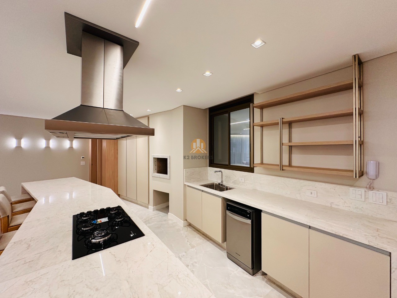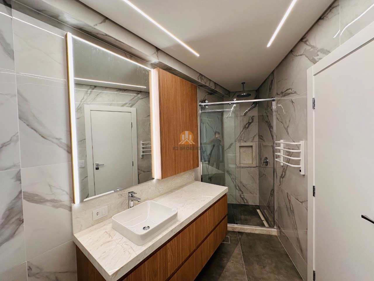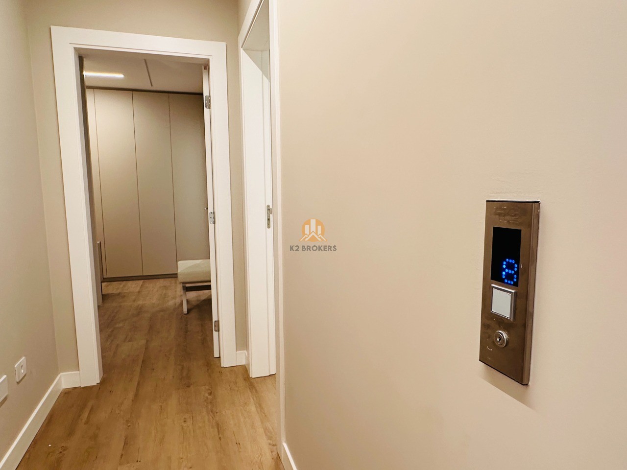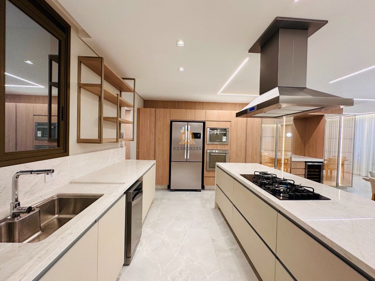 O apartamento é completamente decorado, incluindo eletrodomésticos, com 3 suítes - sendo a master com closet e banheiro duplo -, salas integradas à cozinha, banheiro na lavanderia, com 246m2 e 4 vagas de garagem.