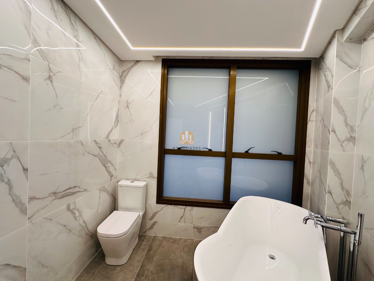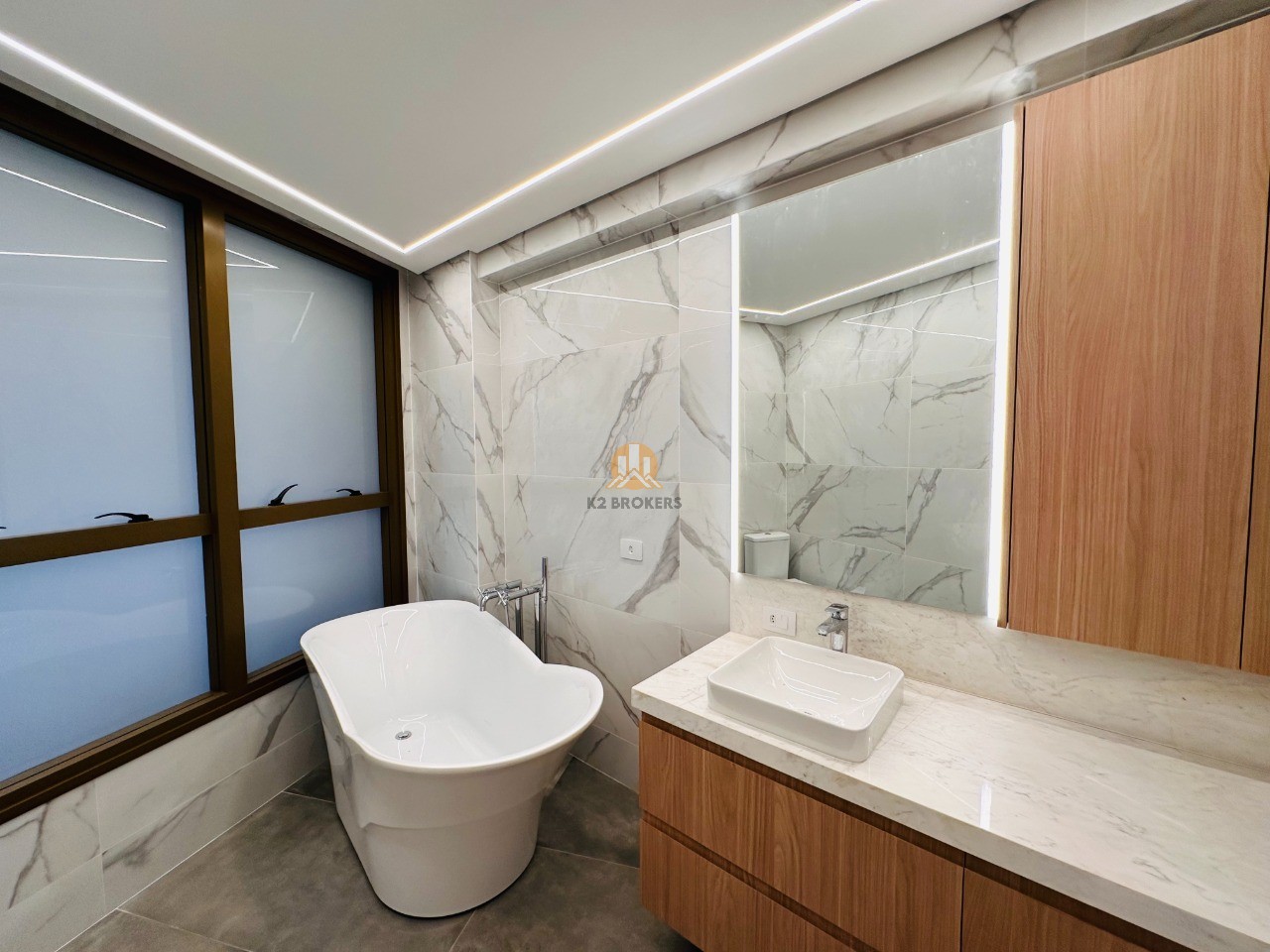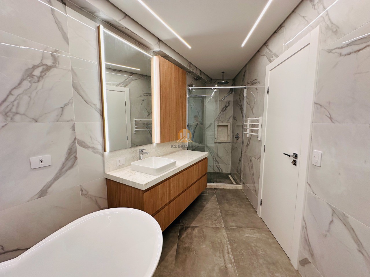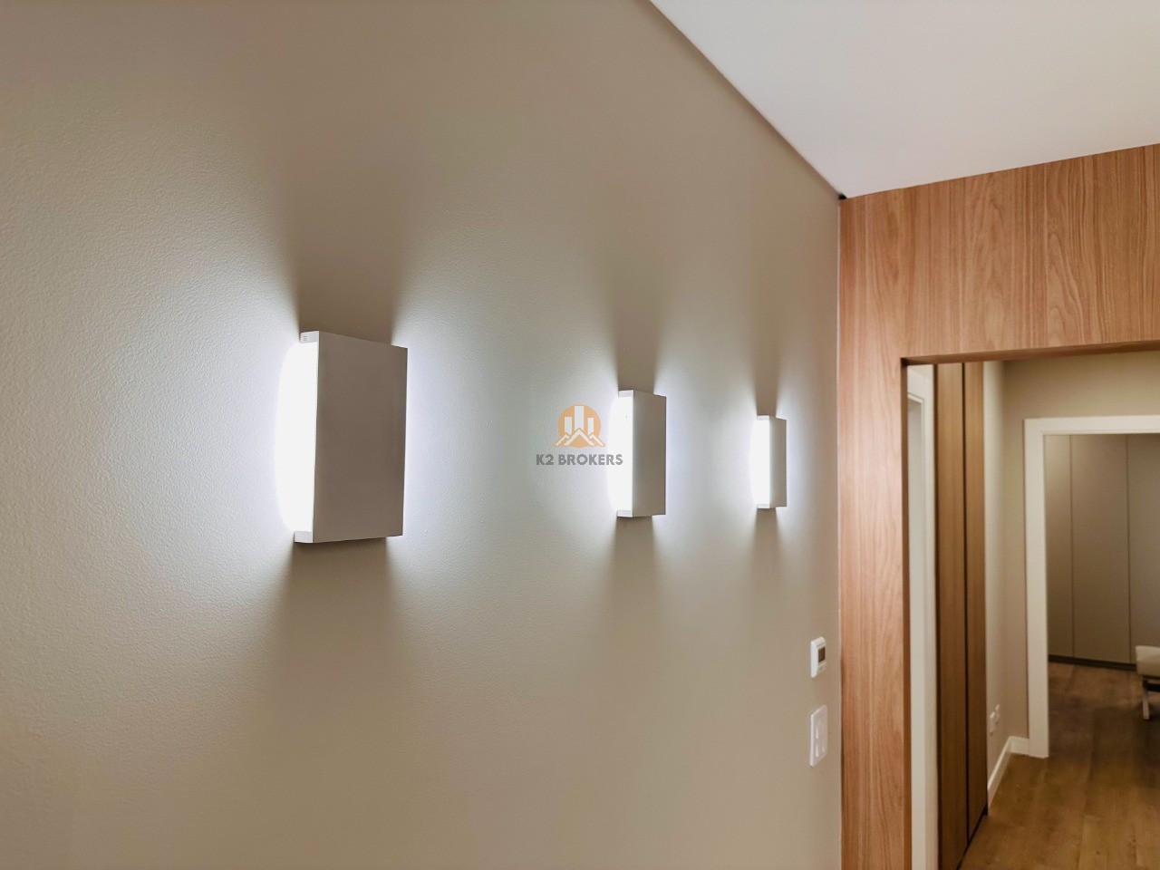 O apartamento é completamente decorado, incluindo eletrodomésticos, com 3 suítes - sendo a master com closet e banheiro duplo -, salas integradas à cozinha, banheiro na lavanderia, com 246m2 e 4 vagas de garagem.