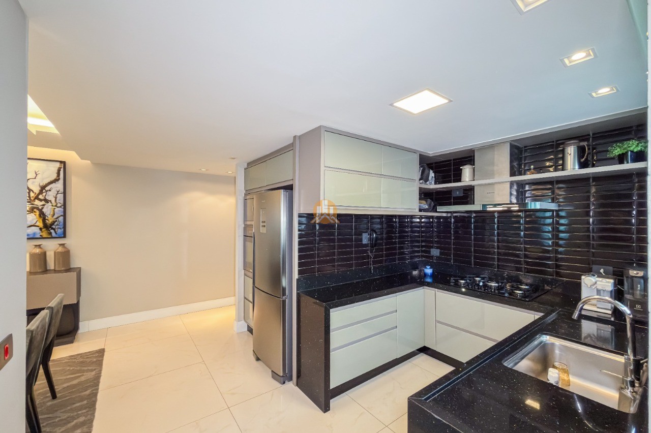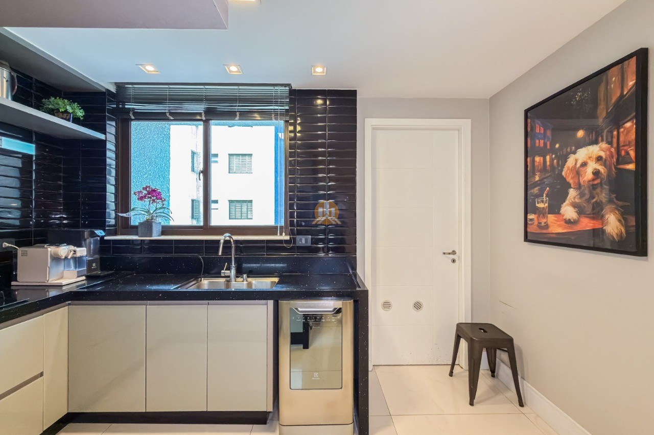 - Cozinha planejada com armários sob medida, eletros embutidos, exaustor, cooktop, geladeira, forno, micro-ondas e lava-louças.