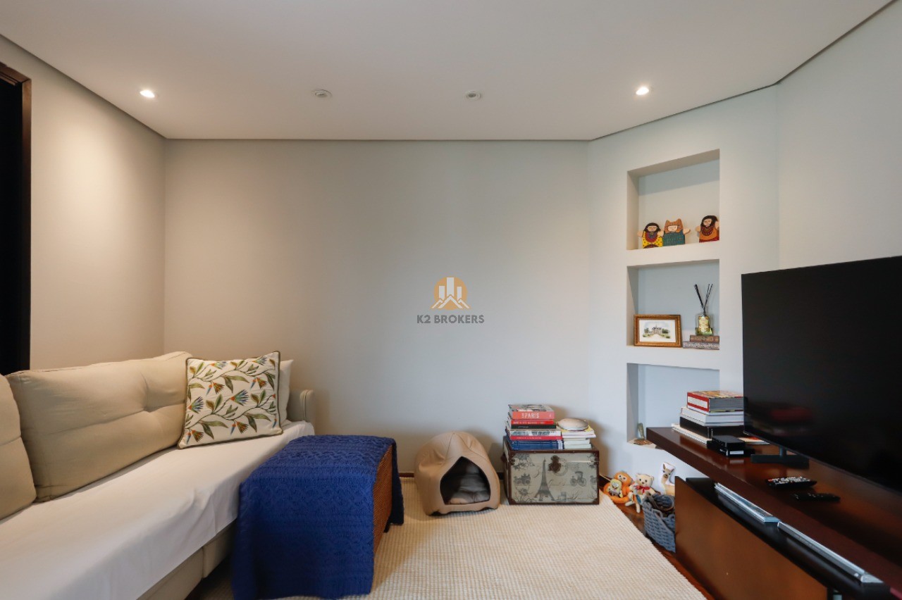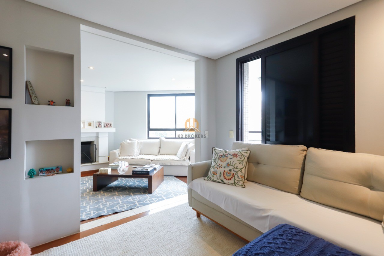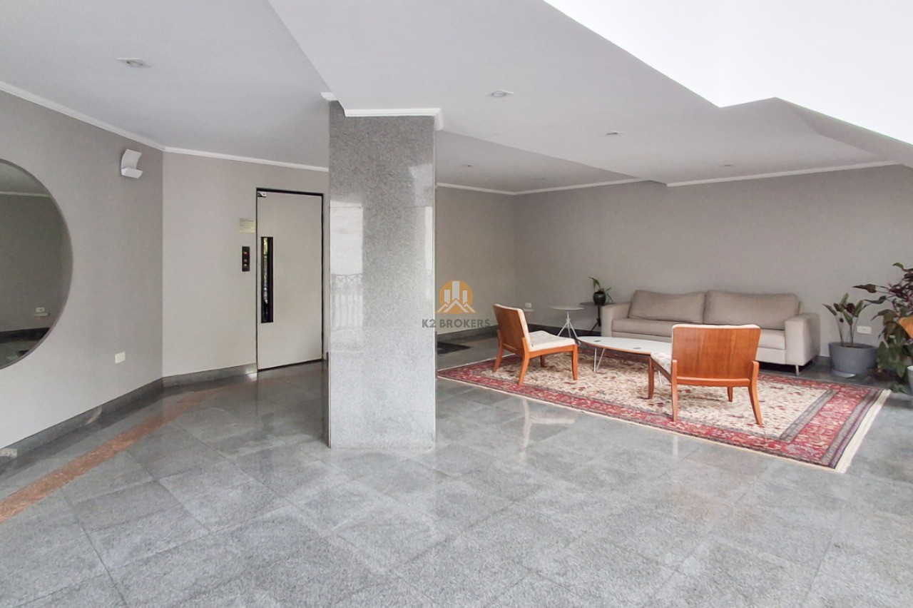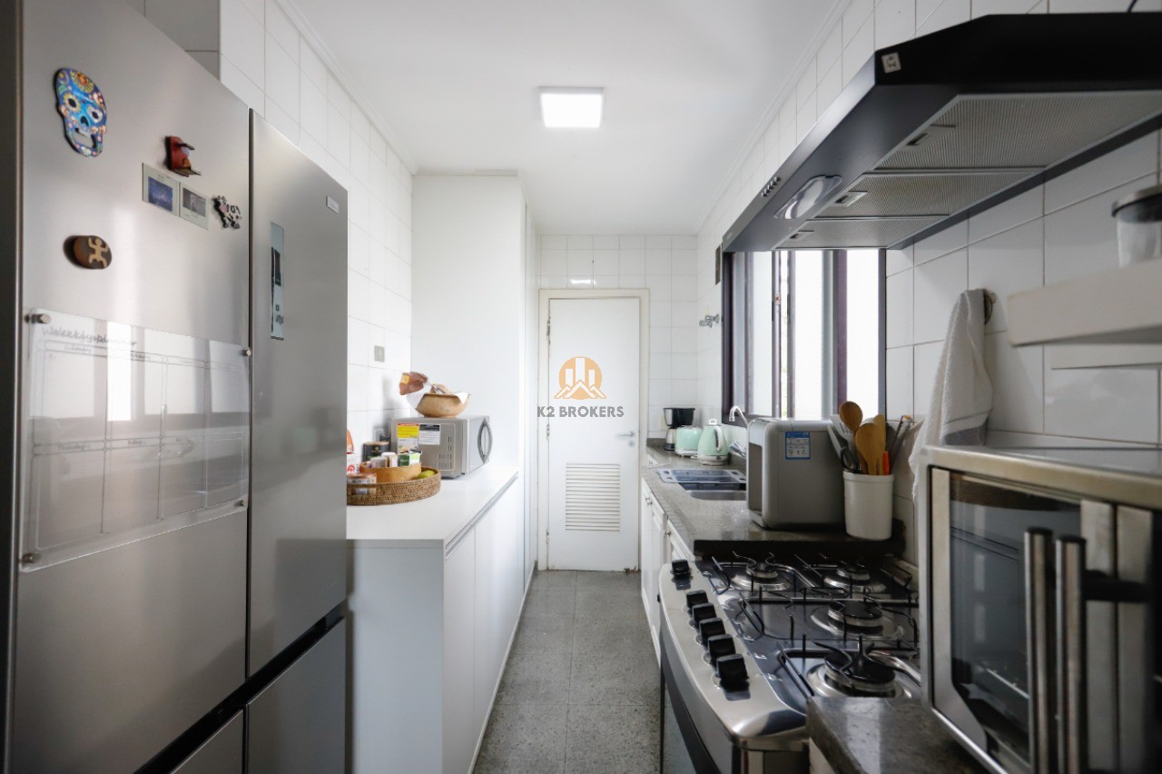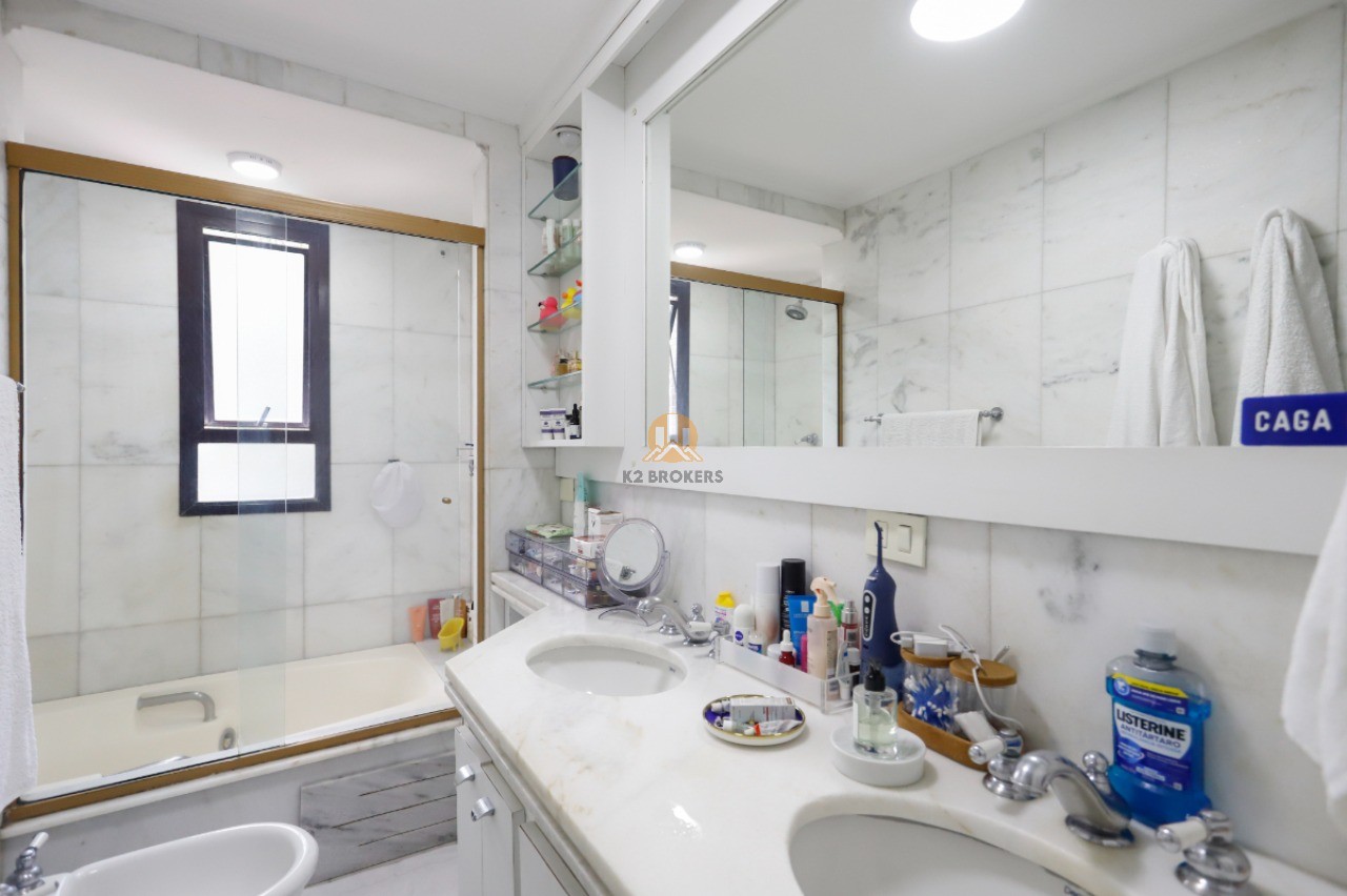 Possui sala ampla com lareira e sacada, lavabo, cozinha com área de serviço independente, dependência de empregada com banheiro, além de 3 vagas de garagem e depósito privativo.