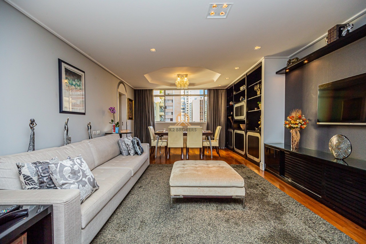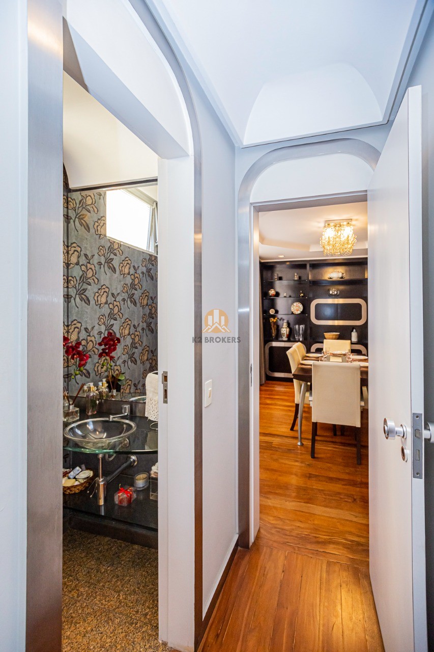 Desde a entrada, você será recebido por um ambiente charmoso e elegante, com hall privativo e acabamento de alto padrão em piso de mármore verde ubatuba. O amplo living oferece muito conforto, com uma sala para 3 ambientes bem definidos e uma varanda com vista lateral. A iluminação embutida e os detalhes sofisticados das prateleiras dão um toque de luxo ao ambiente.