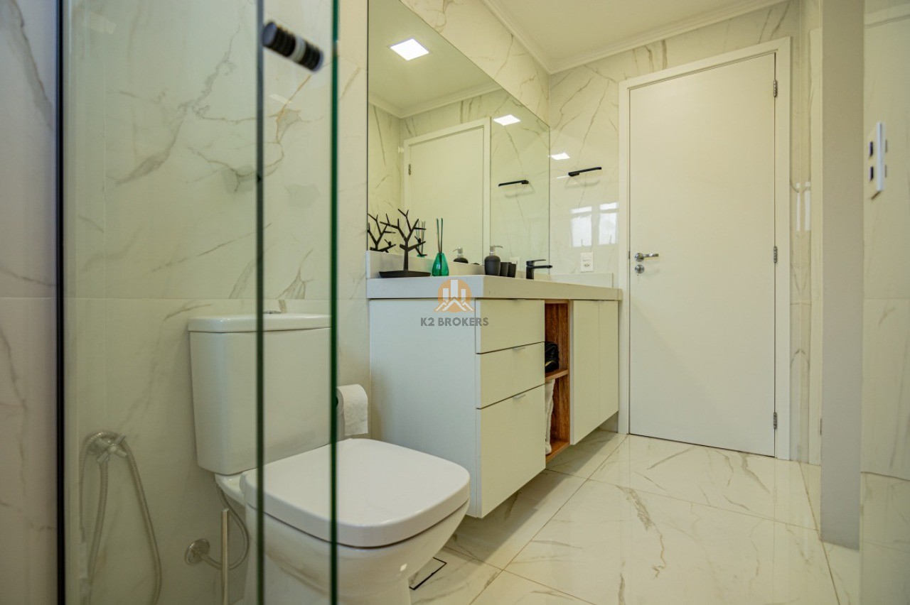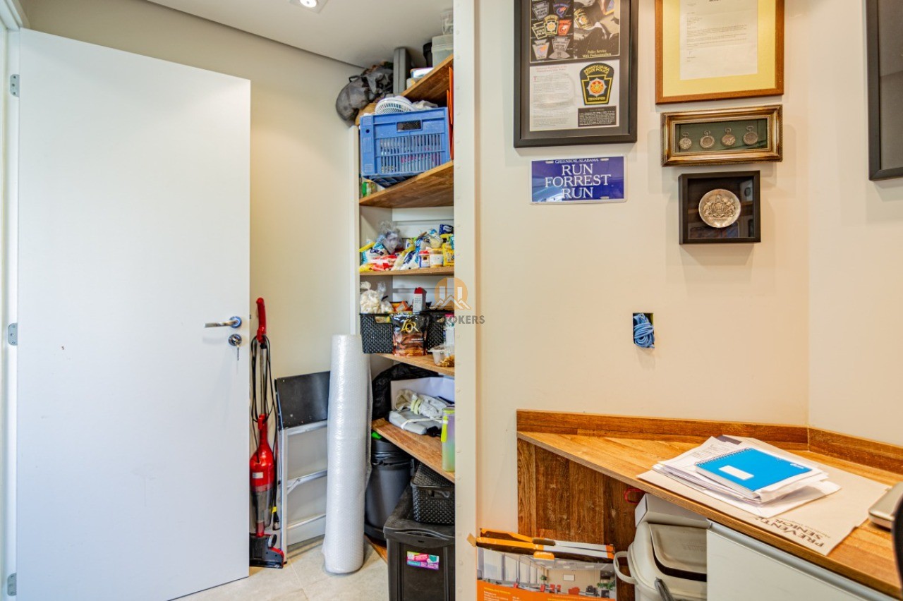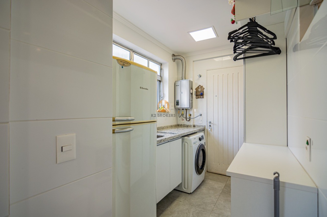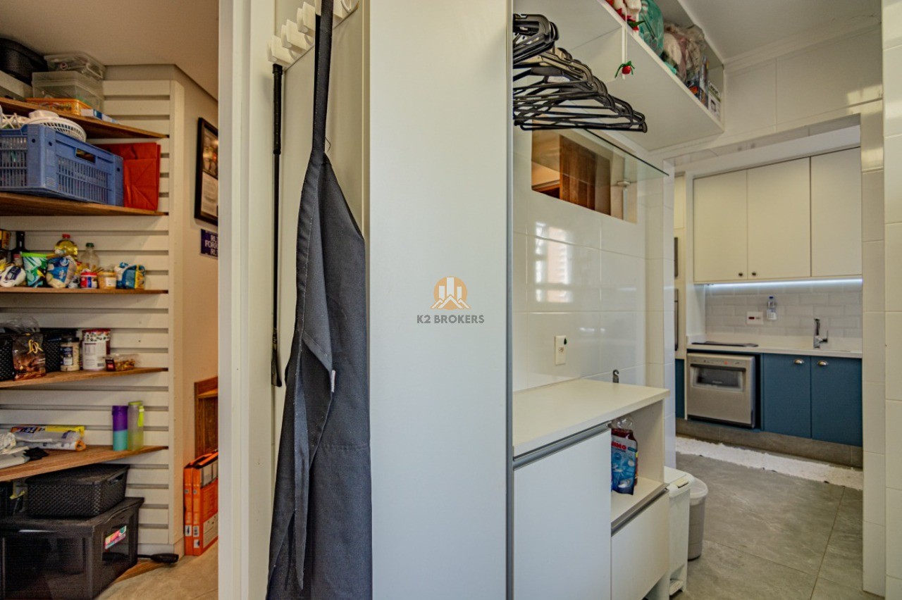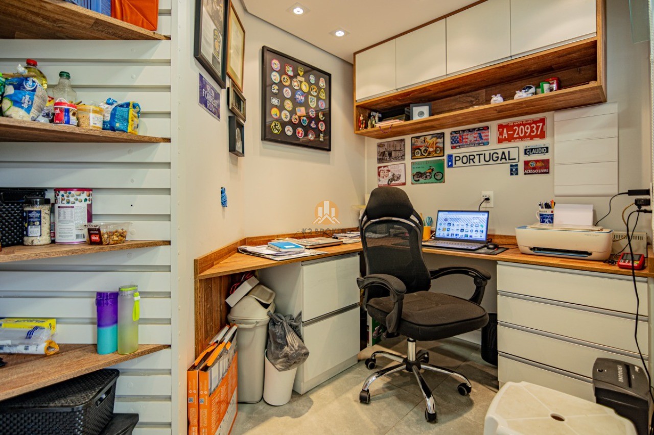 Os armários planejados da marca Valcenter, com garantia vitalícia, são um destaque à parte, trazendo elegância e funcionalidade à cozinha ampla, que conta com janelas amplas e torneiras de água quente. A área de serviço conta com despensa e escritório, tornando as tarefas do dia a dia mais práticas e organizadas.