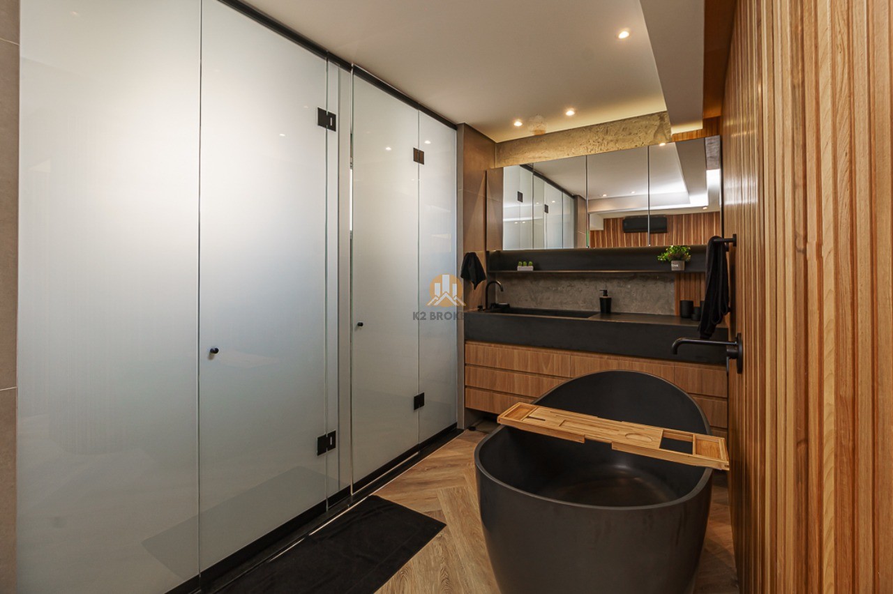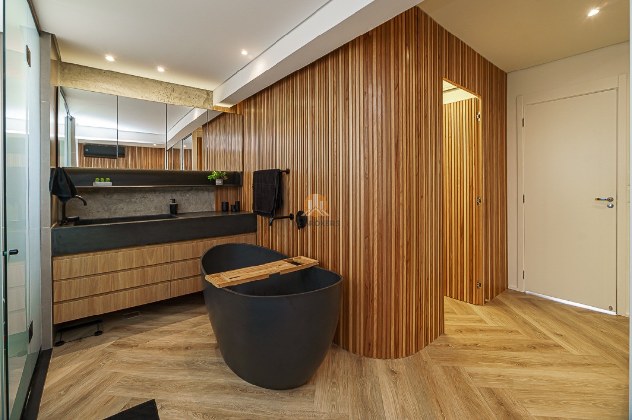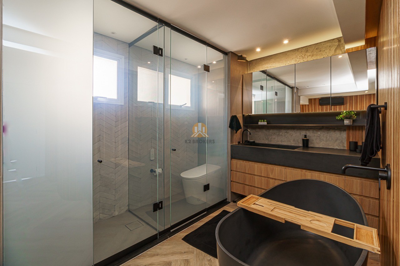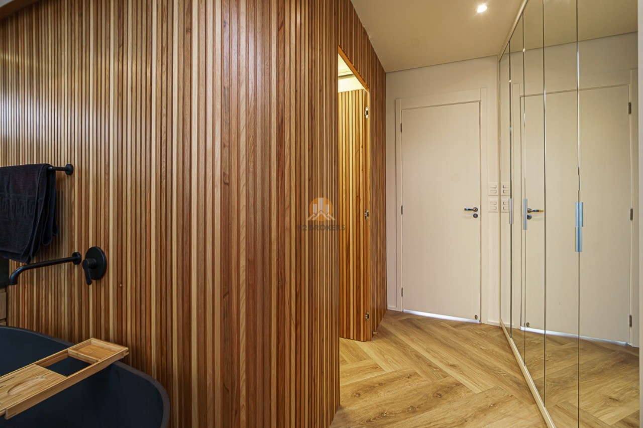 Além disso, as suítes são equipadas com ar condicionado e automação nas janelas, sendo a suíte master um verdadeiro refúgio com closet, banheira de pedra natural negra e varanda com escritório. O banheiro da suíte master possui vidro inteligente e privada eletrônica estilo japonês.
