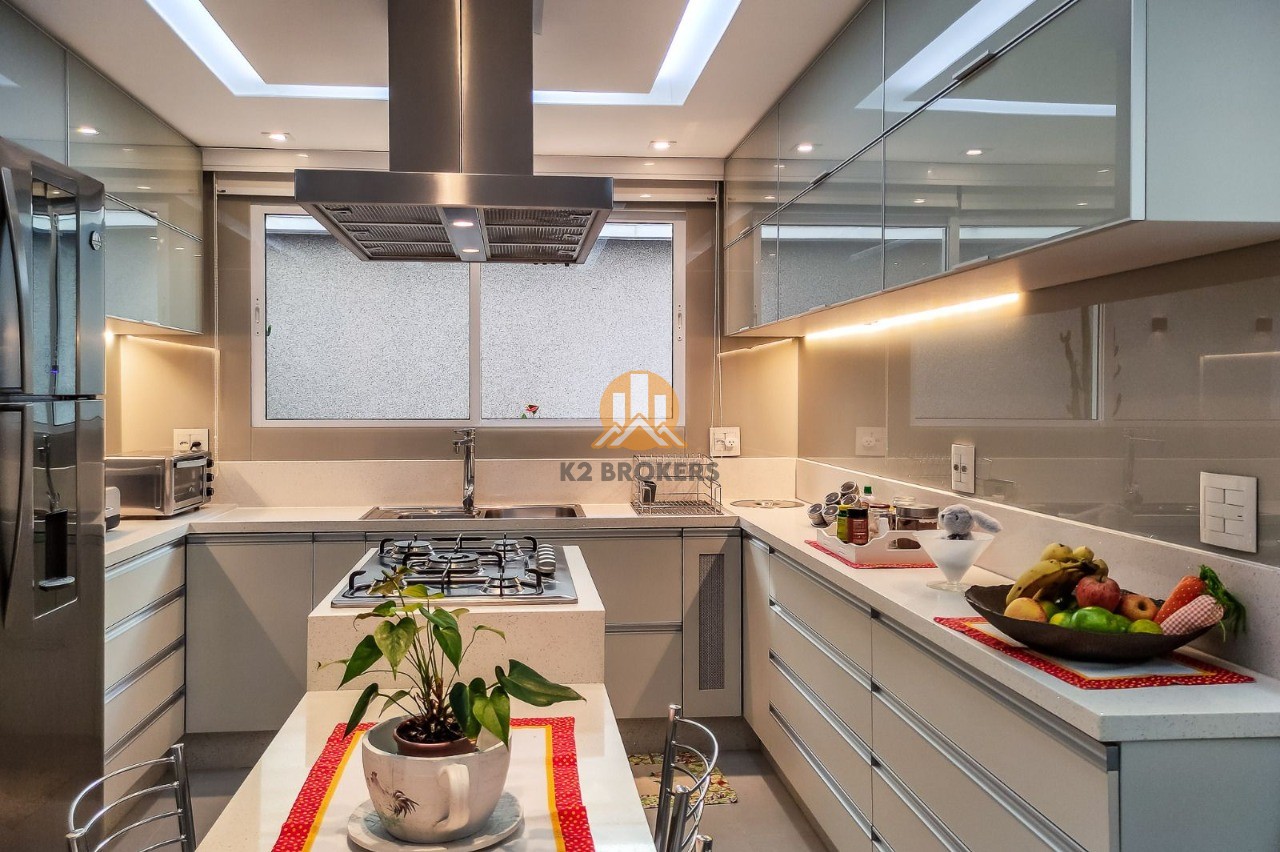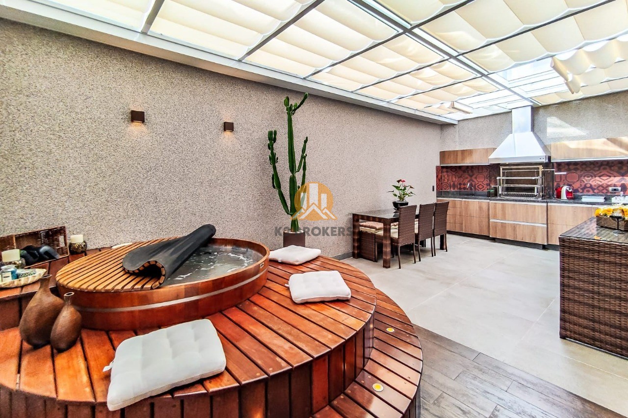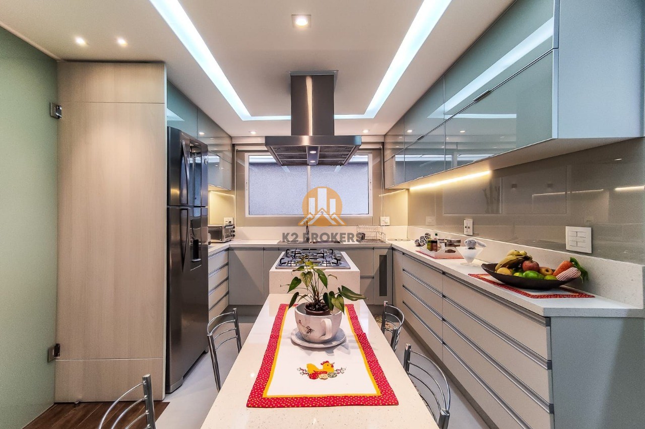 A cozinha é completa, com armários planejados, exaustor, cooktop e iluminação em LED. Além disso, a casa dispõe de sala de jantar, sala de estar com lareira e uma sacada perfeita para relaxar.