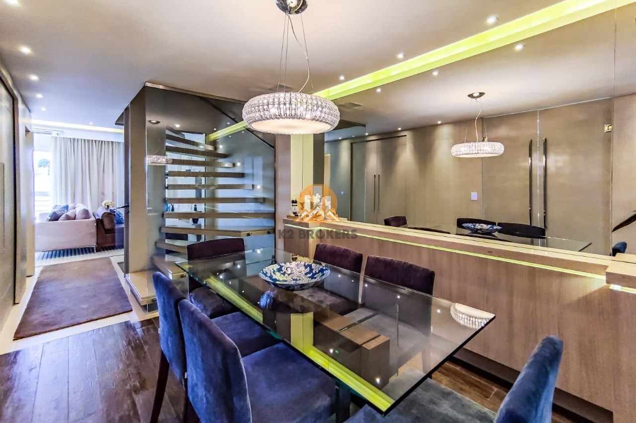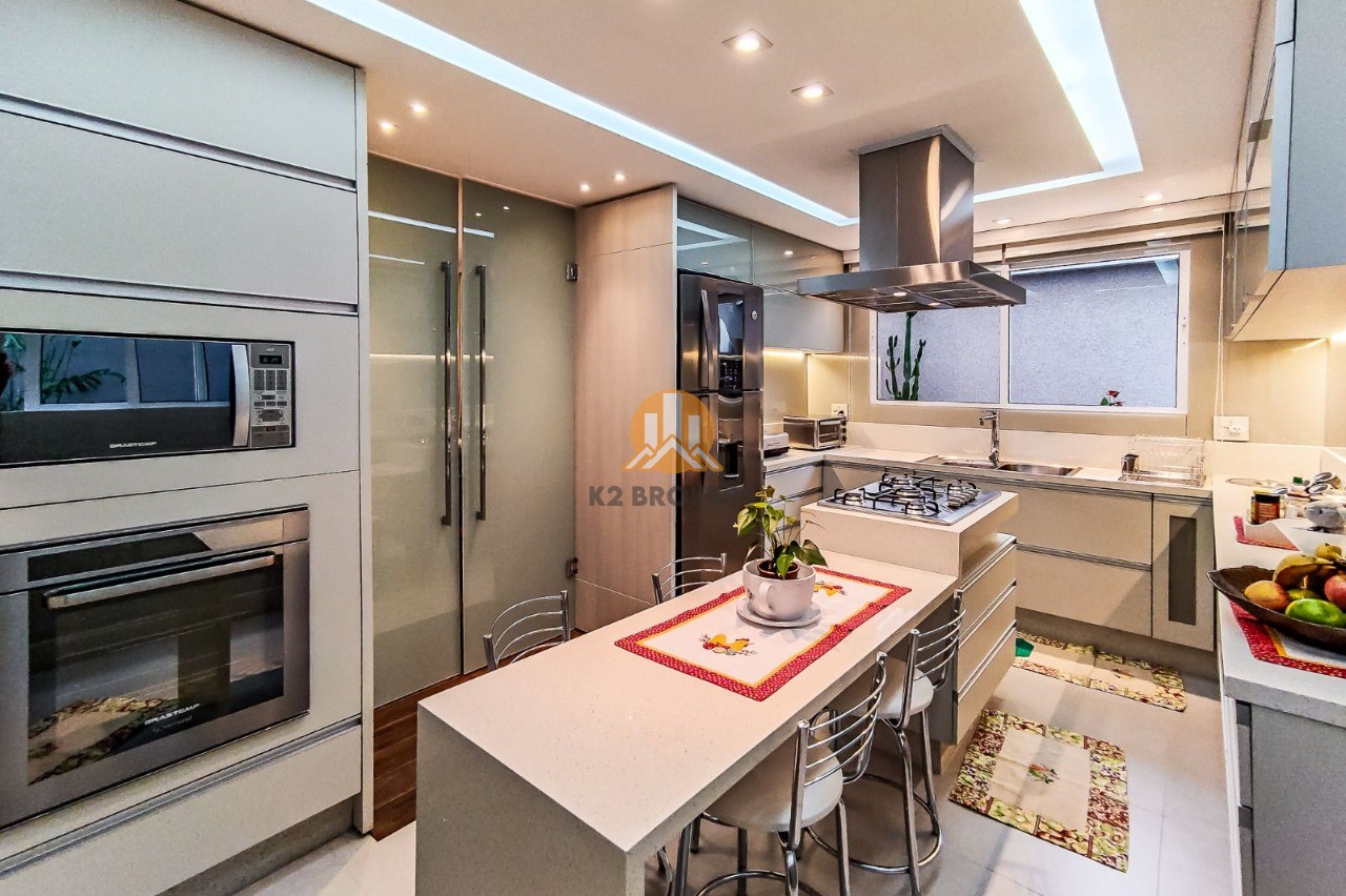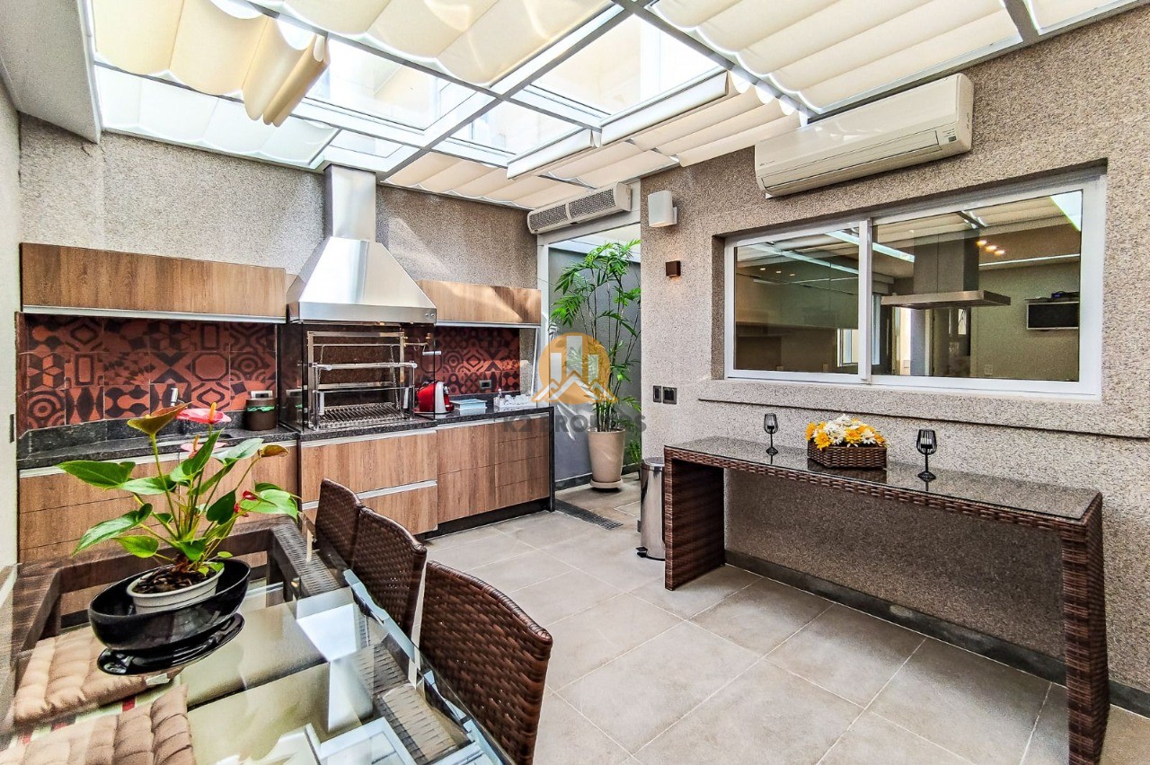 A cozinha é completa, com armários planejados, exaustor, cooktop e iluminação em LED. Além disso, a casa dispõe de sala de jantar, sala de estar com lareira e uma sacada perfeita para relaxar.