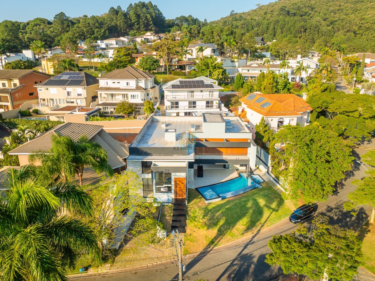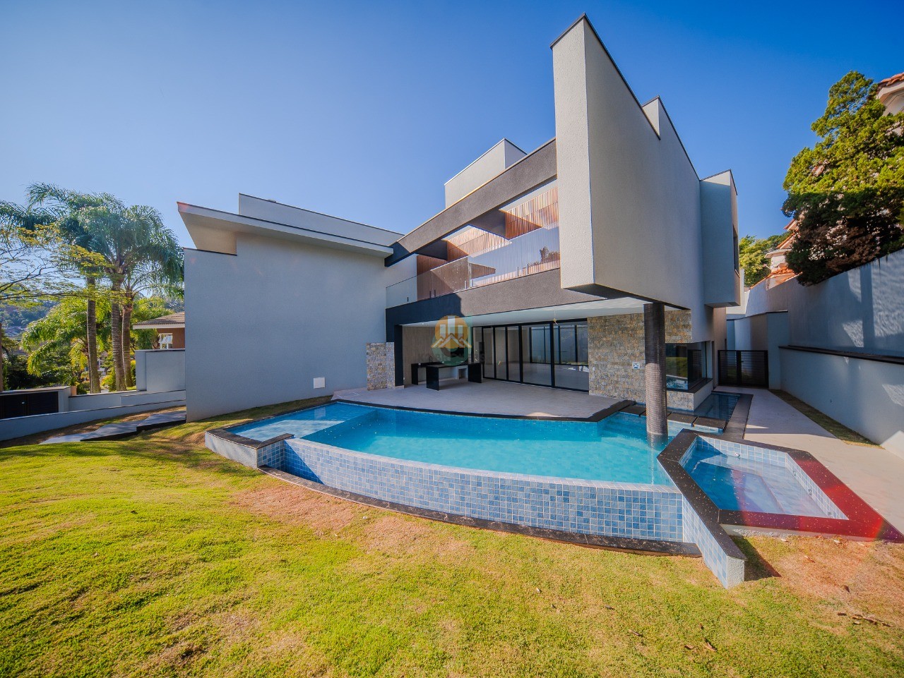 Com 5 suítes, sendo a master com closet e hidromassagem, um living integrado para 3 ambientes com pé-direito alto, elevador, sala de cinema, escritório, adega, cozinha ampla com ilha e despensa, área gourmet completa e ensolarada, piscina, spa, vestiário, dependência para colaboradores e 10 vagas cobertas de garagem, esta casa foi projetada para oferecer o máximo de conforto e elegância.