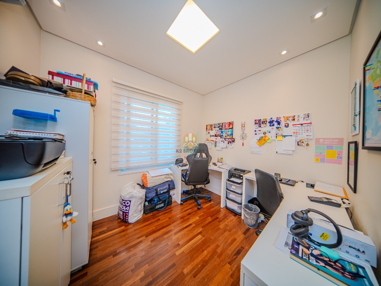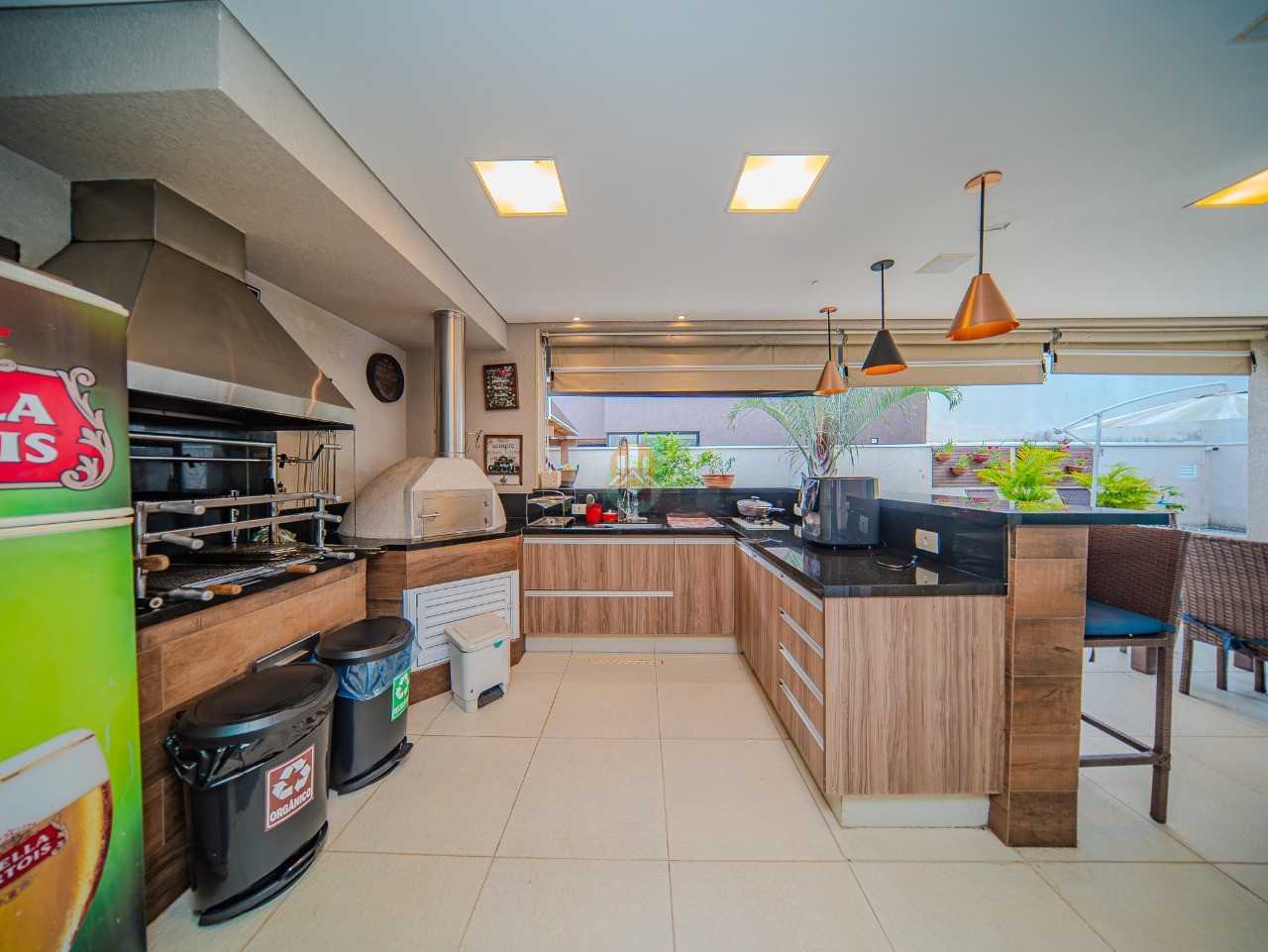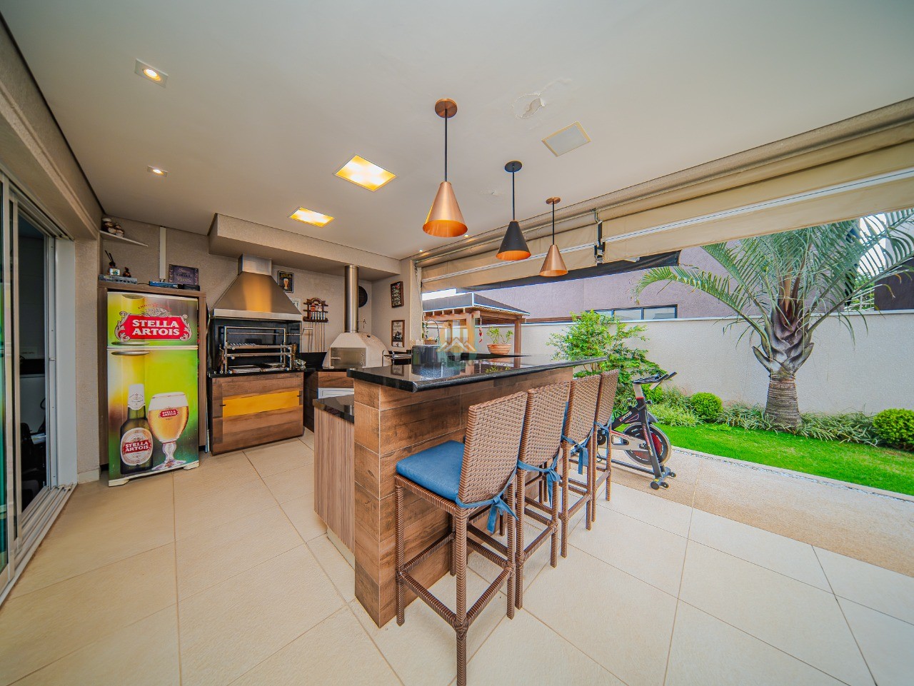 A cozinha planejada com marcenaria de alto padrão e o escritório montado são perfeitos para quem busca um espaço funcional, como um home office. A sala de estar integrada com a área gourmet proporciona momentos únicos em família, e o espaço gourmet completo com churrasqueira, forno de pizza, cooktop e armários planejados é um convite à boa gastronomia.