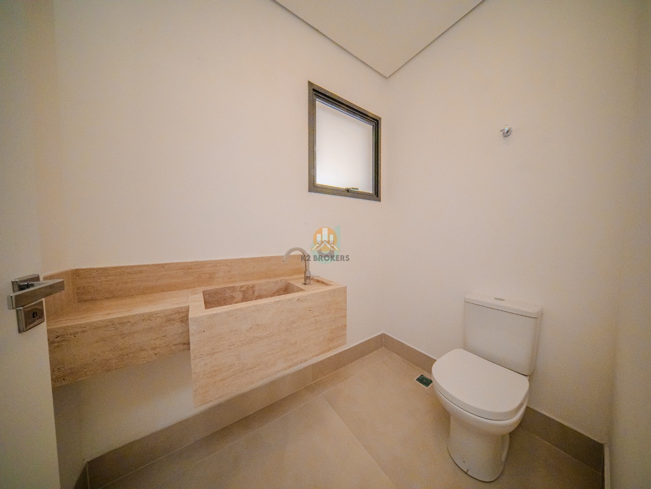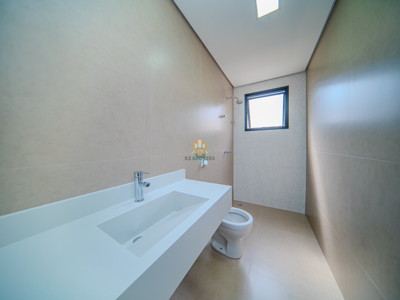 Claraboias nos banheiros para iluminação natural e sofisticação.