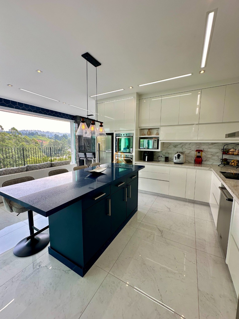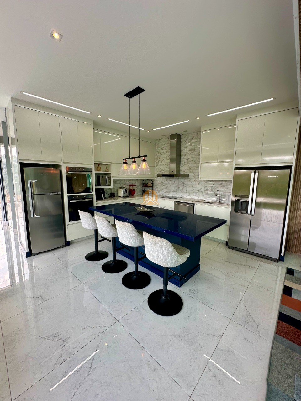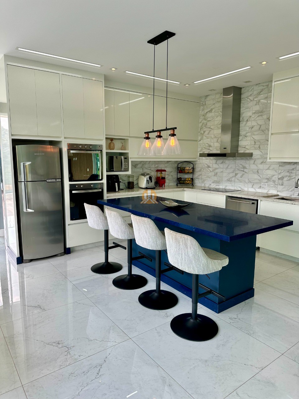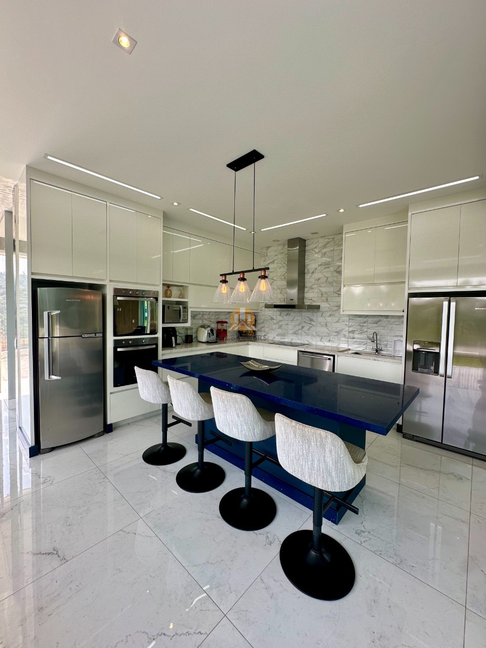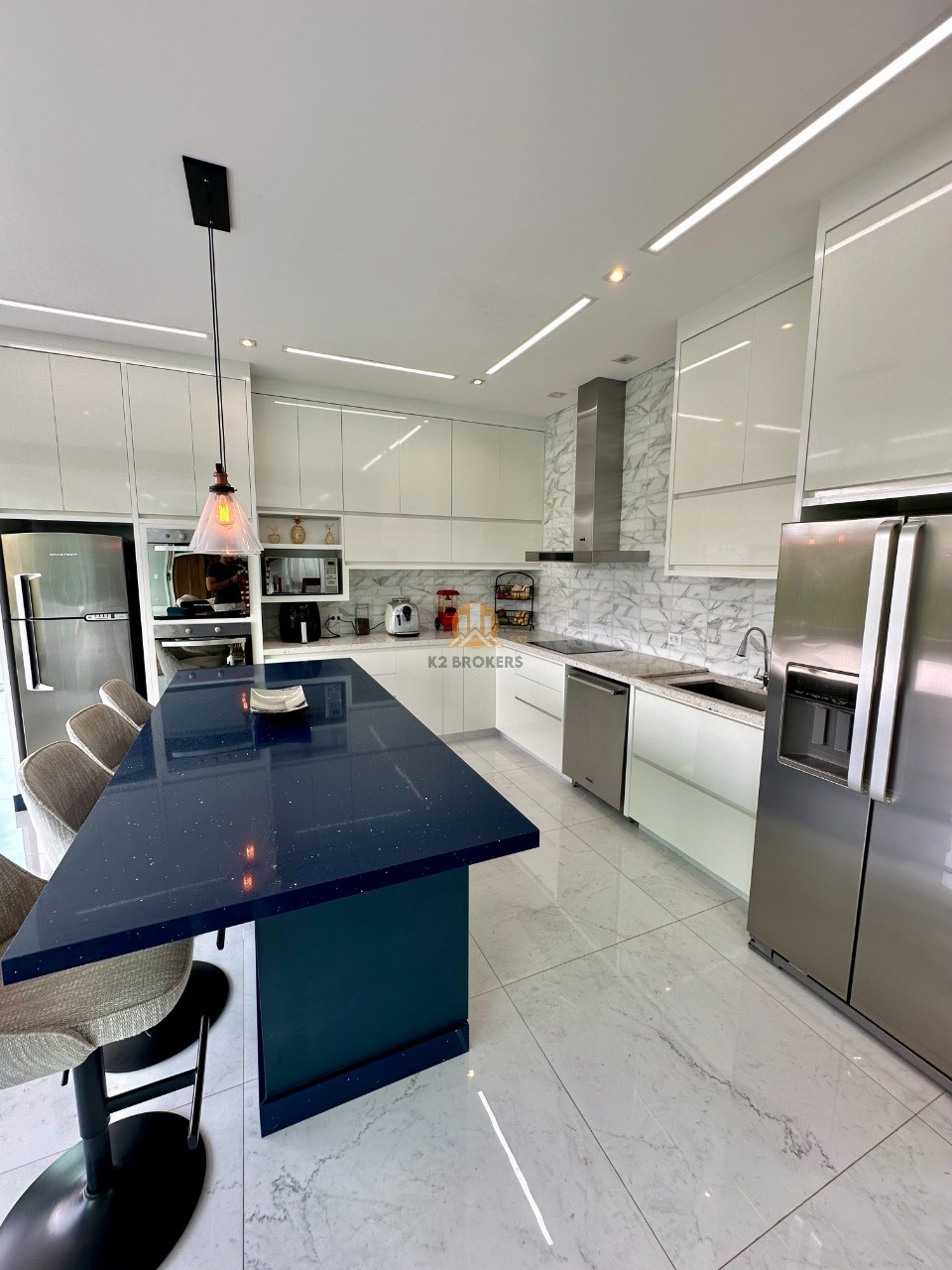 A cozinha é totalmente equipada com eletrodomésticos de ponta, incluindo 2 geladeiras, 2 fornos (elétrico e a gás), lava louças e muito mais, ideal para quem valoriza praticidade e elegância.