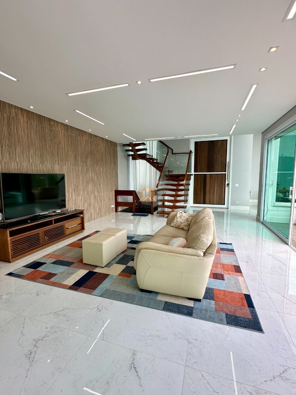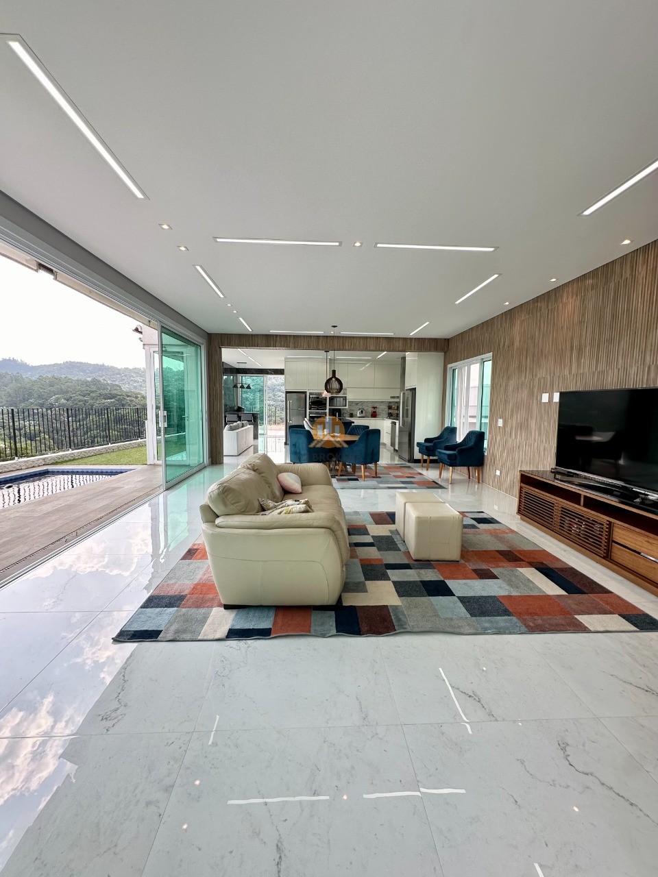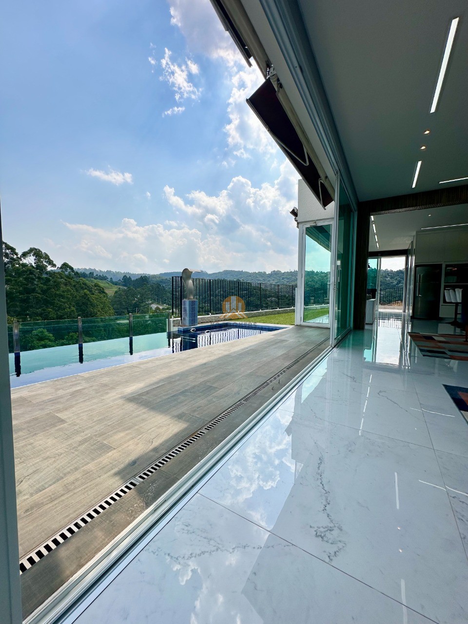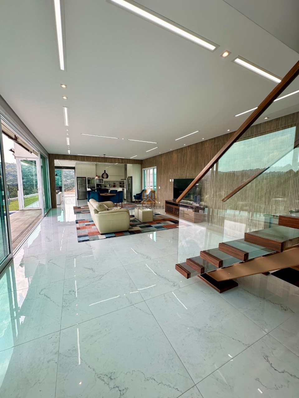 O pavimento térreo é um convite ao convívio e ao entretenimento, com um living integrado para 3 ambientes (sala com lareira, estar e jantar). A área gourmet conta com um bar e é conectada à área externa, onde a piscina aquecida com borda infinita cria um ambiente perfeito para relaxamento.